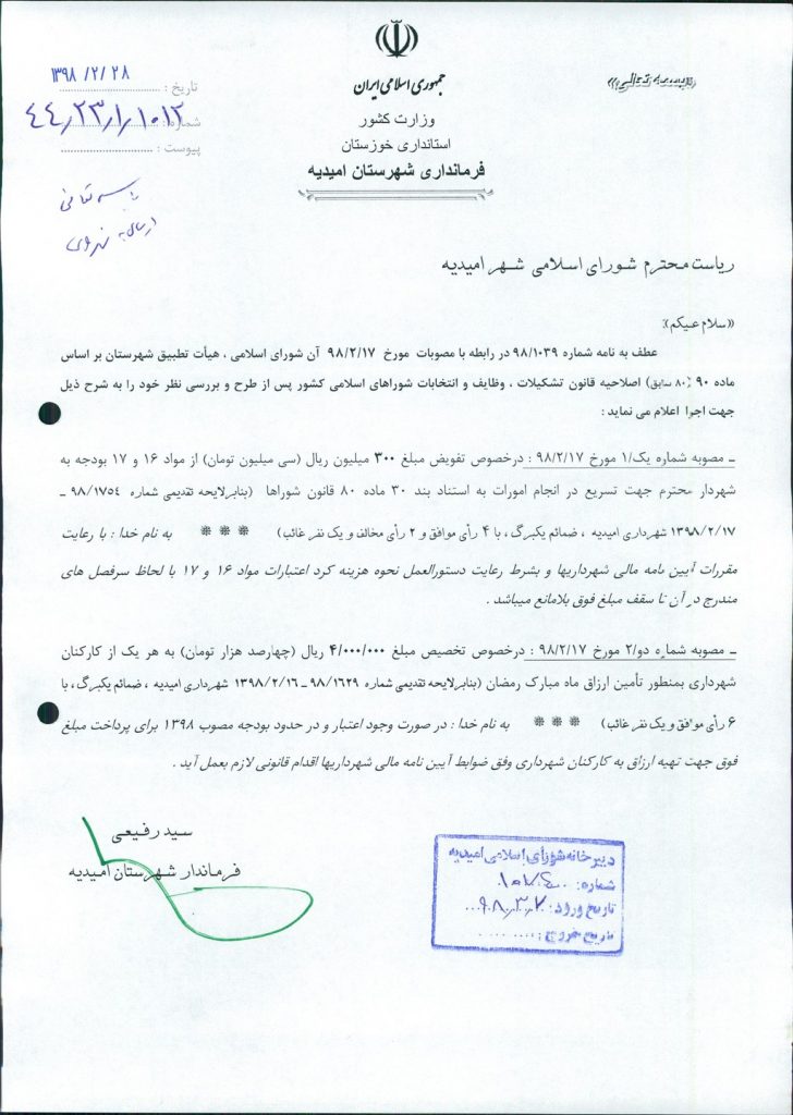 نظریه هیأت تطبیق جلسه ۶۴ مورخ ۹۸/۲/۱۷ شورای اسلامی شهر امیدیه