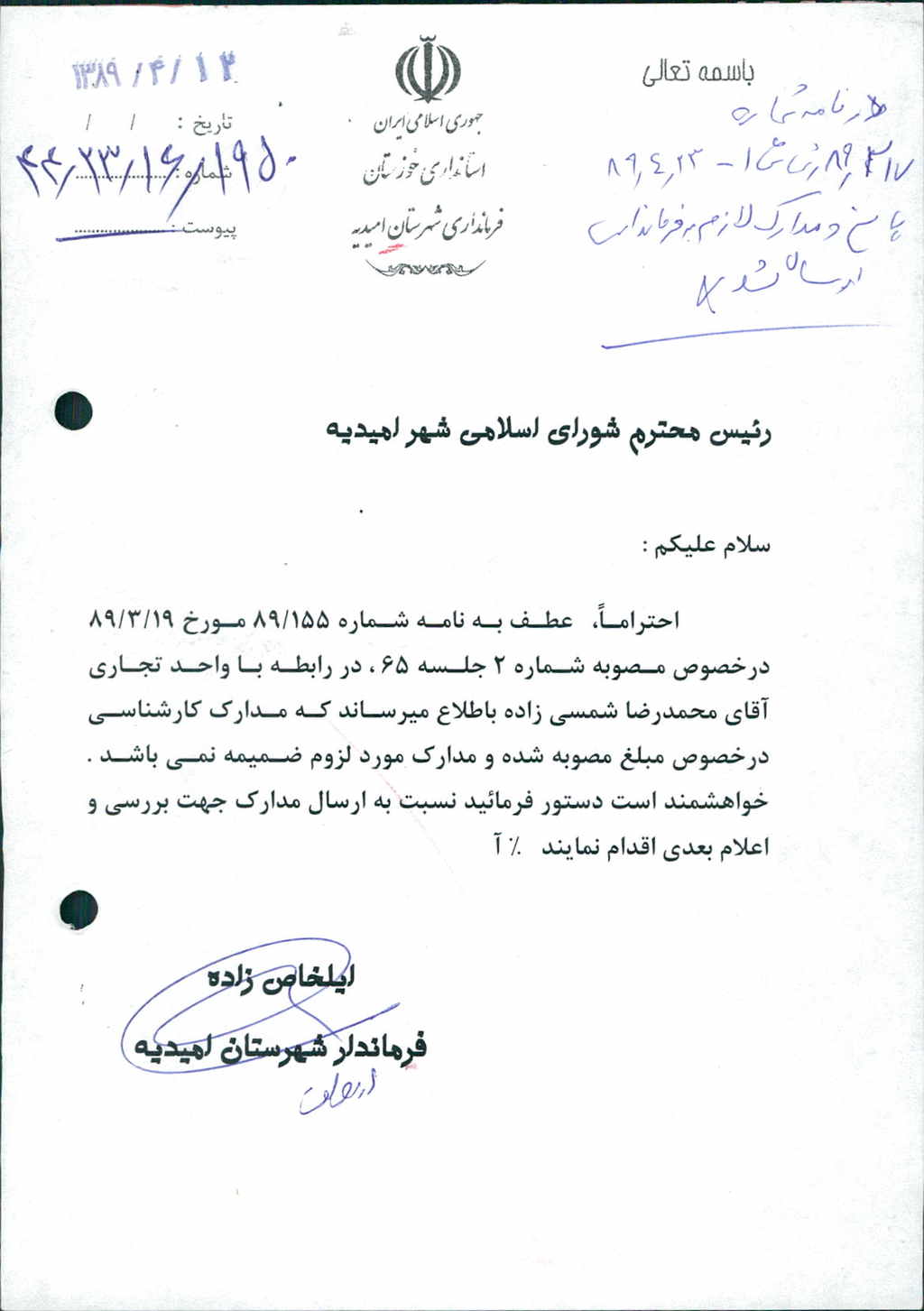 نظریه هیأت تطبیق جلسه ۶۵ مورخ ۸۹/۳/۱۱ شورای اسلامی شهر امیدیه