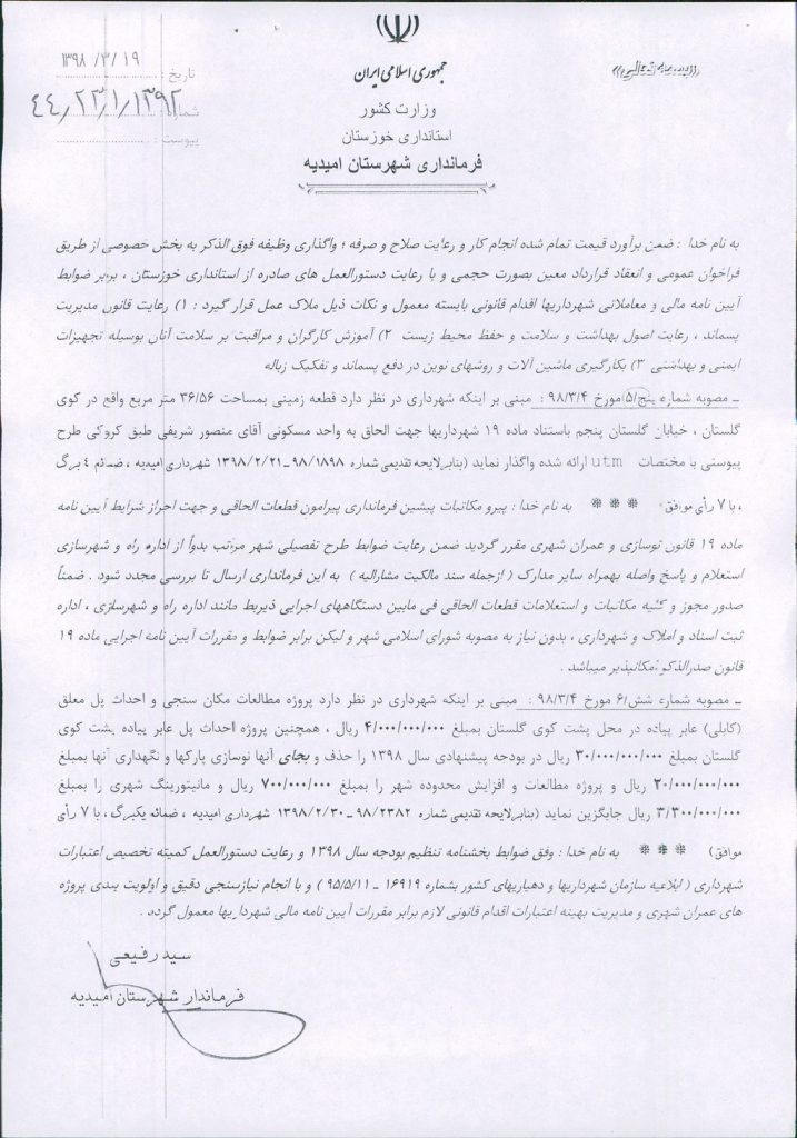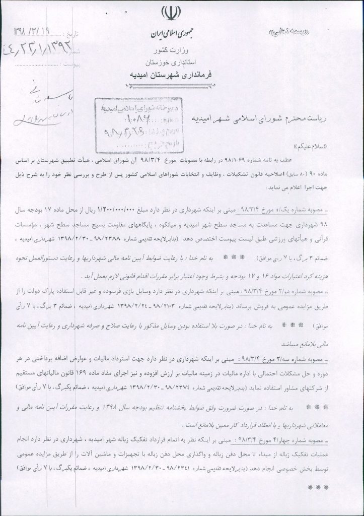 نظریه هیأت تطبیق جلسه ۶۶ مورخ ۹۸/۳/۴ شورای اسلامی شهر امیدیه