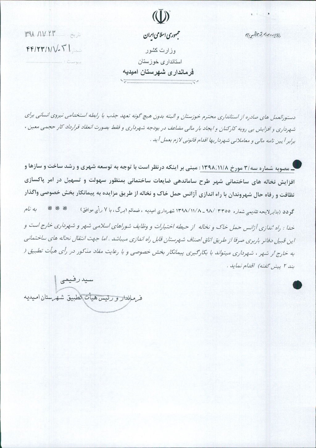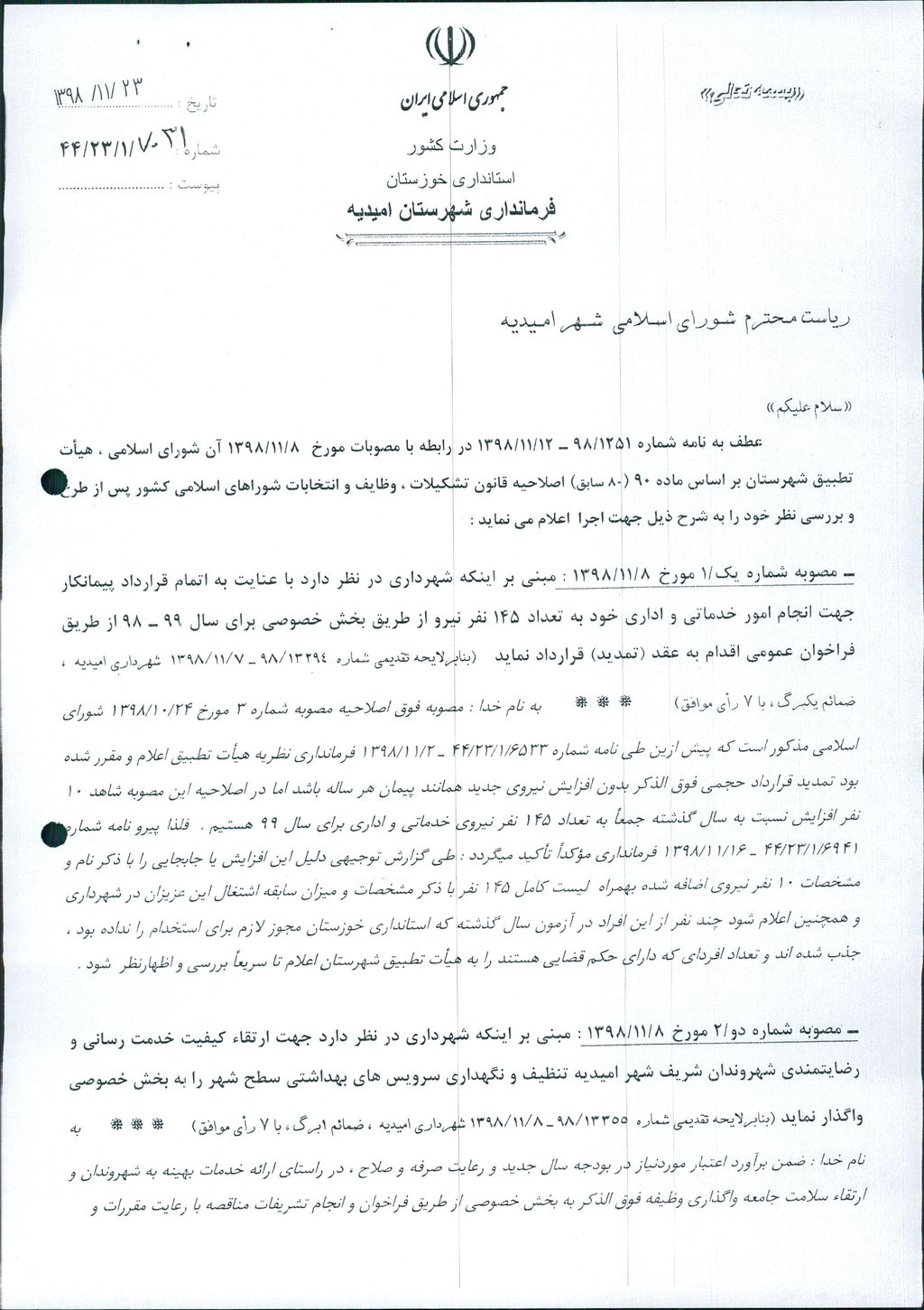 نظریه هیأت تطبیق جلسه ۸۲ مورخ ۹۸/۱۱/۸ شورای اسلامی شهر امیدیه