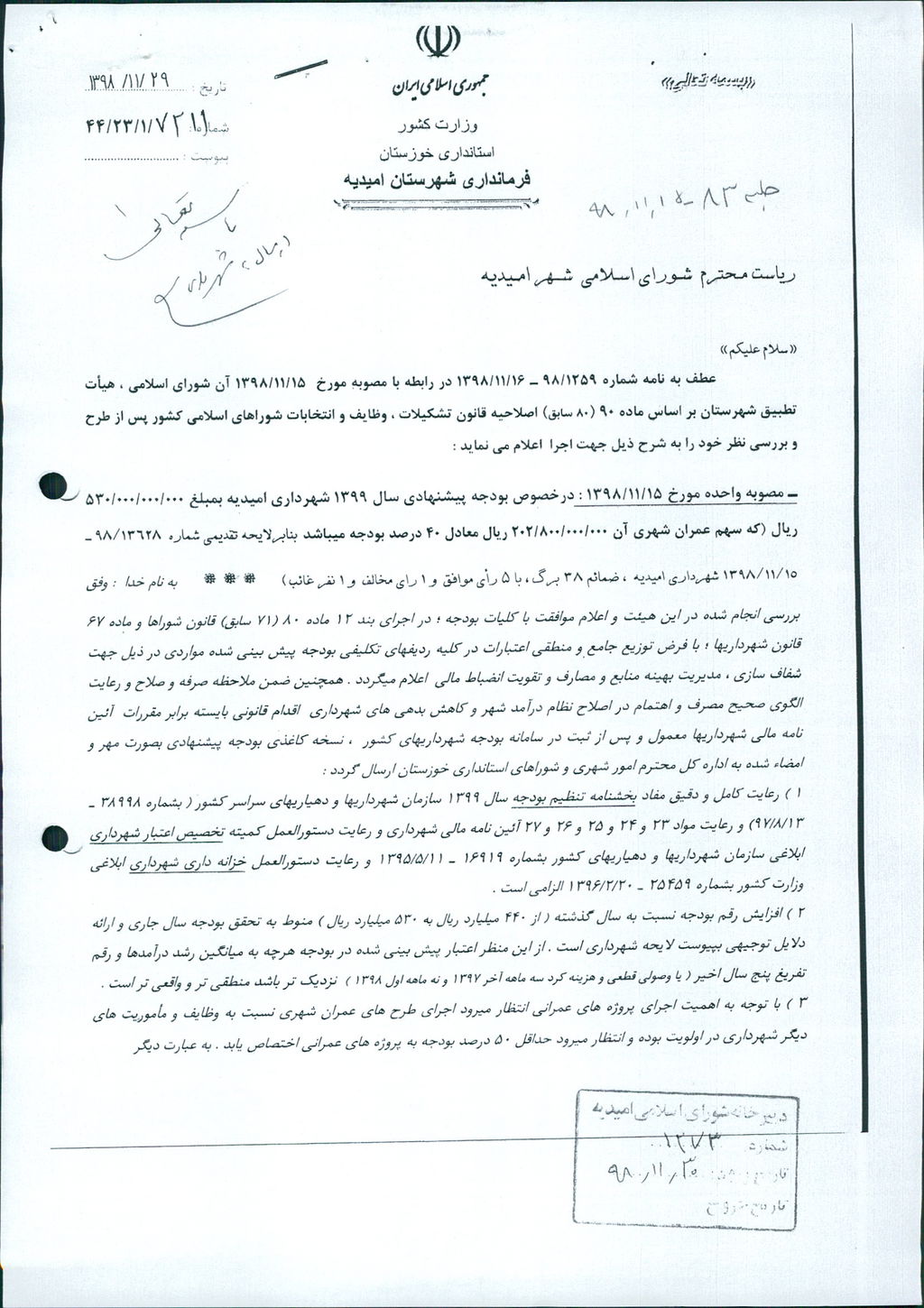 نظریه هیأت تطبیق جلسه ۸۳ مورخ ۹۸/۱۱/۱۵ شورای اسلامی شهر امیدیه