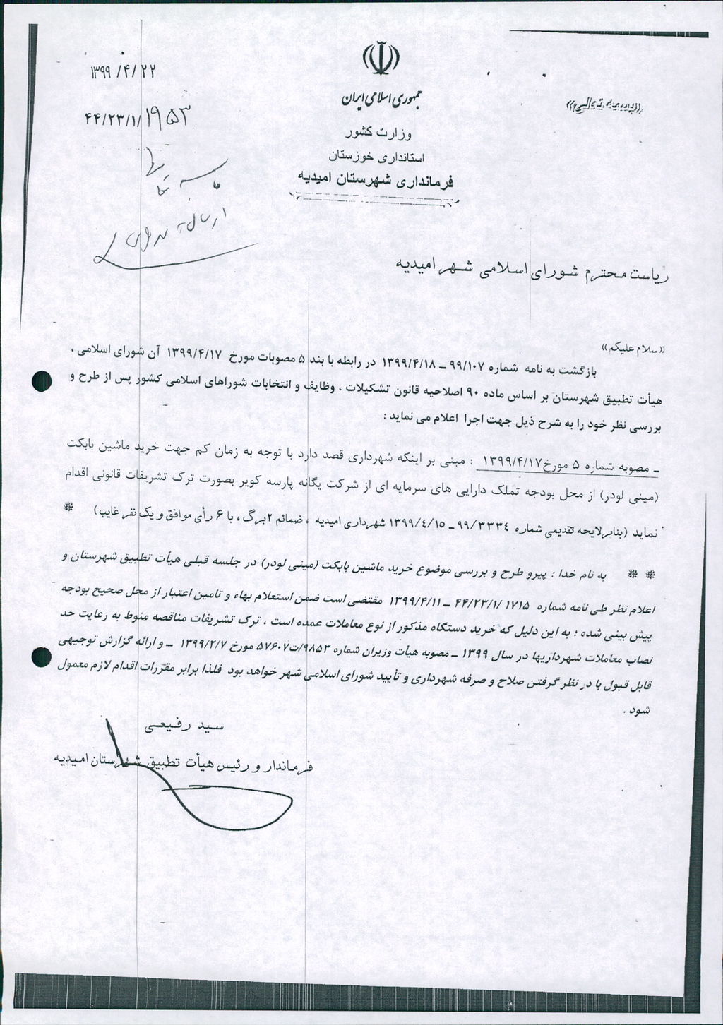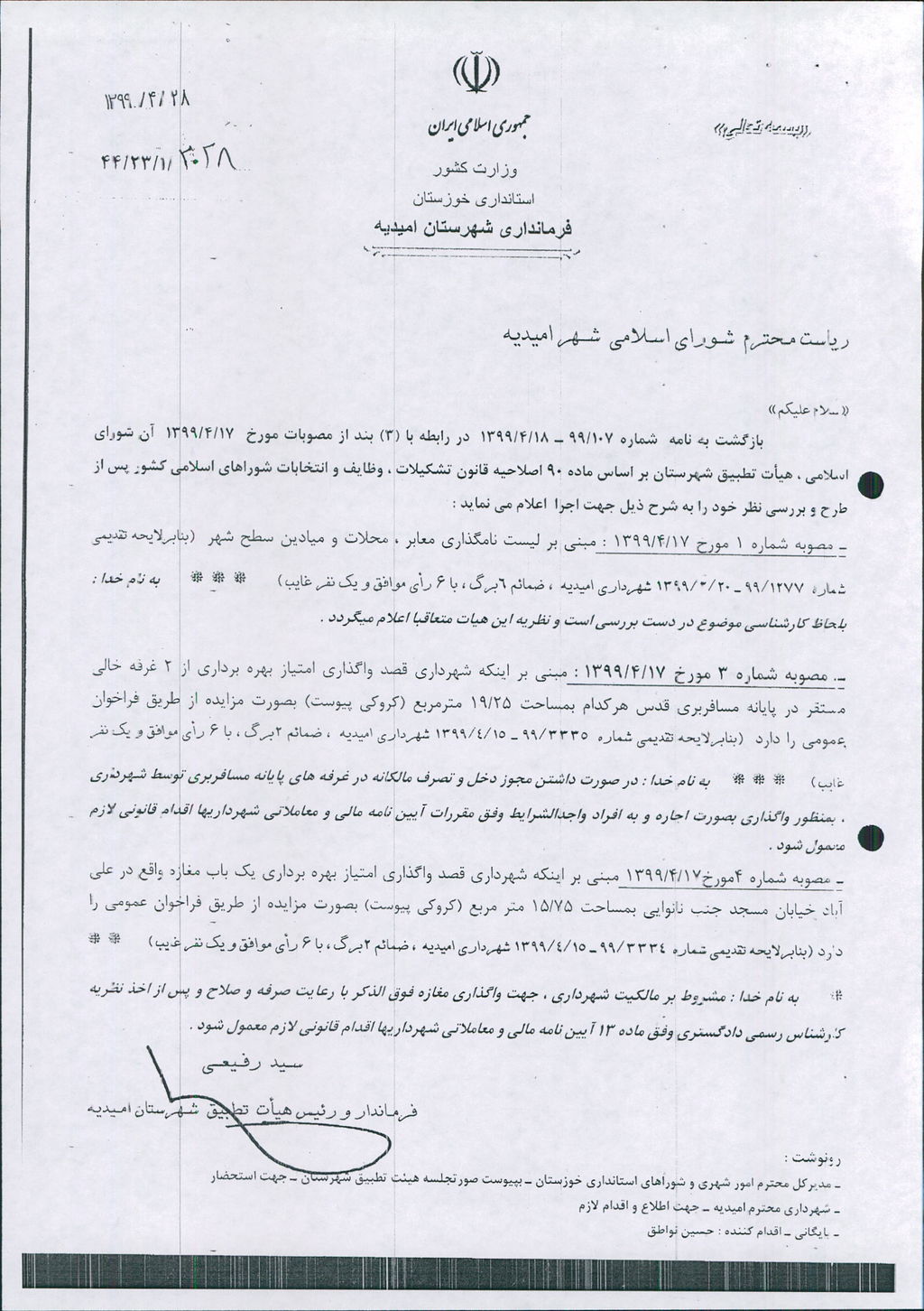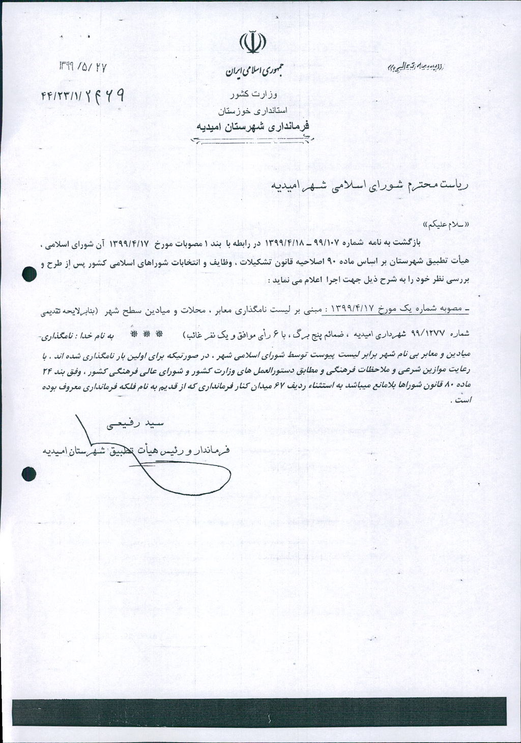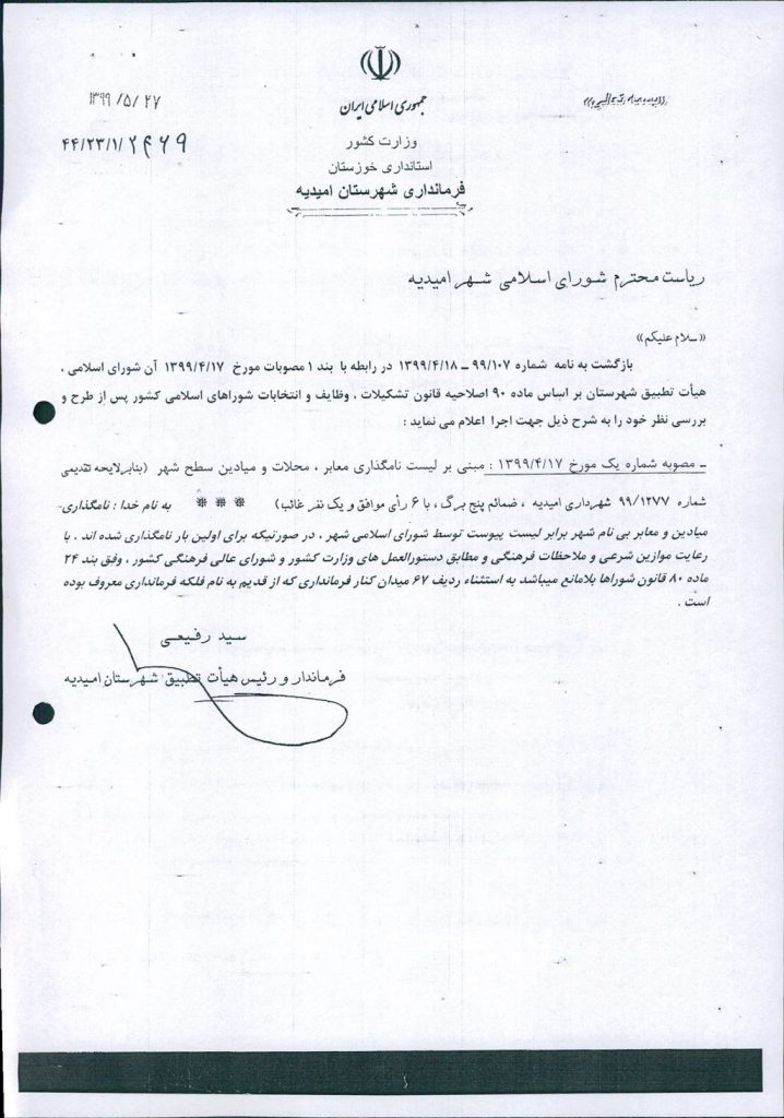 نظریه هیأت تطبیق جلسه ۹۲ مورخ ۹۹/۴/۱۷ شورای اسلامی شهر امیدیه