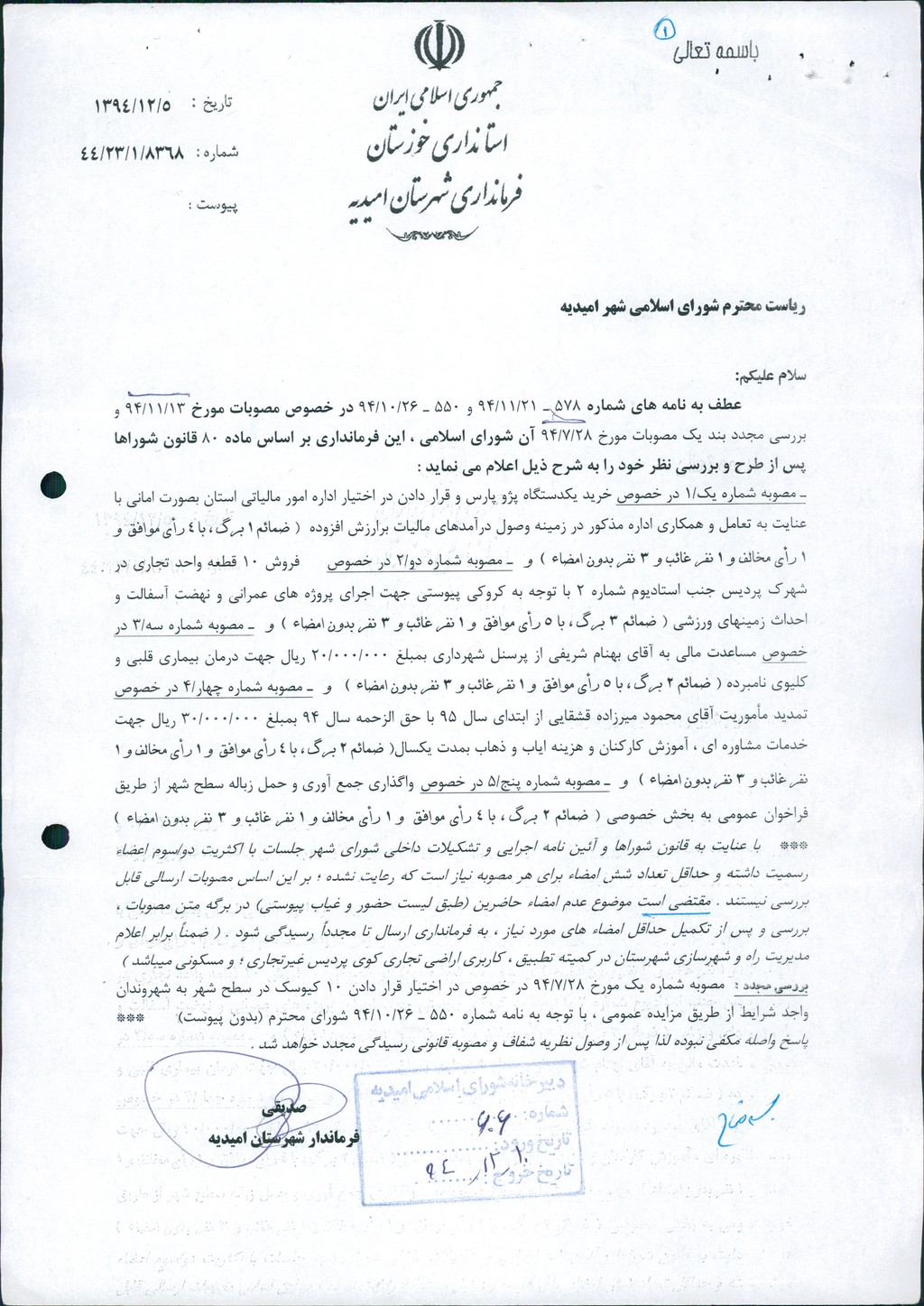 نظریه هیأت تطبیق جلسه ۹۳ مورخ ۹۴/۴/۱۳ شورای اسلامی شهر امیدیه