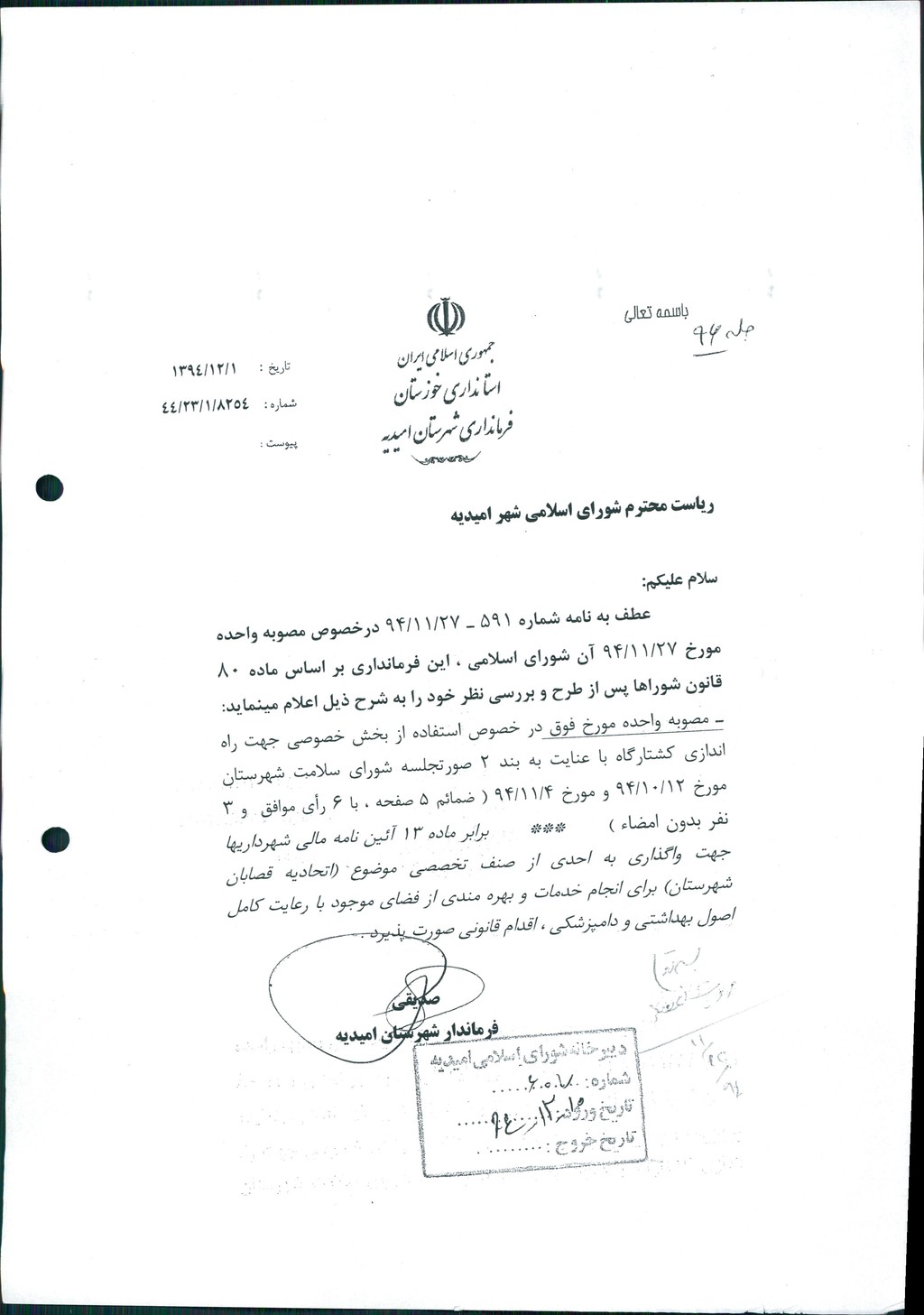نظریه هیأت تطبیق جلسه ۹۶ مورخ ۹۴/۱۱/۲۷ شورای اسلامی شهر امیدیه
