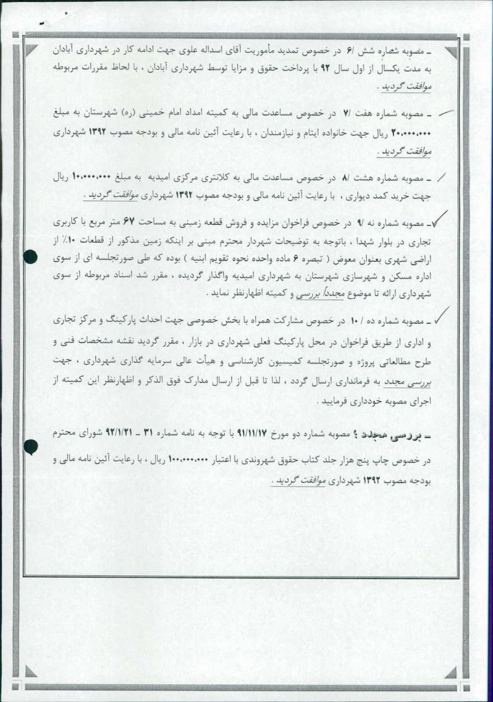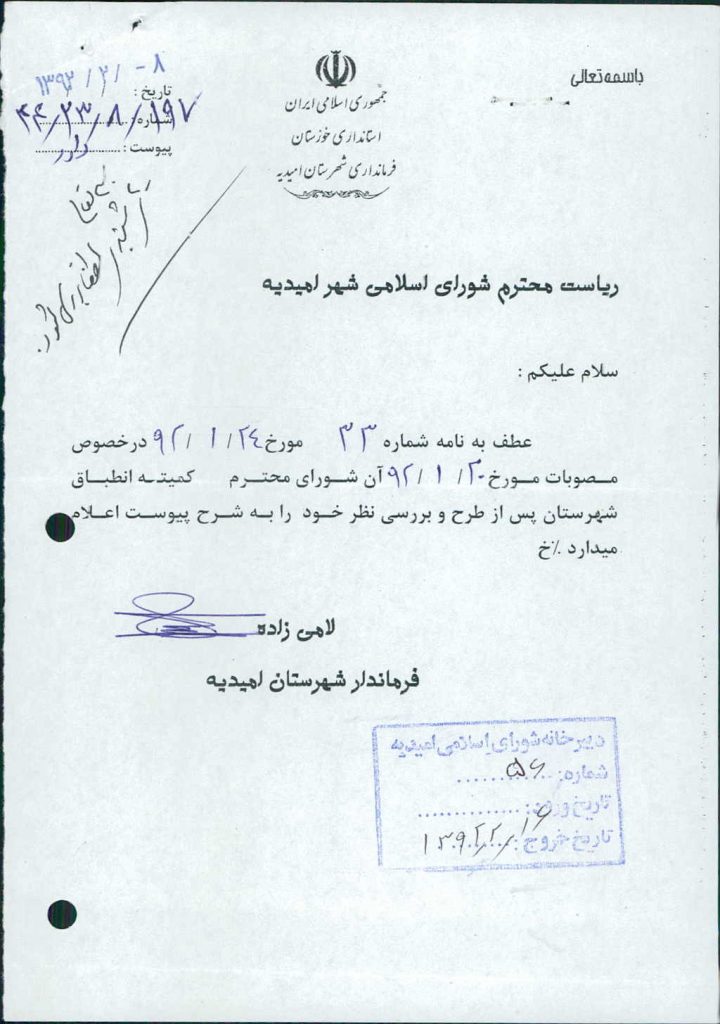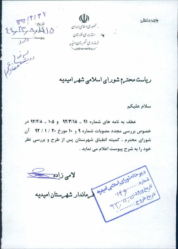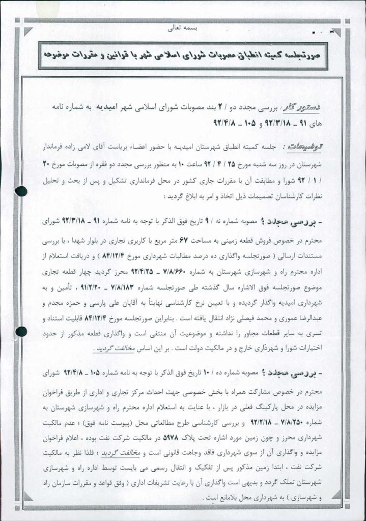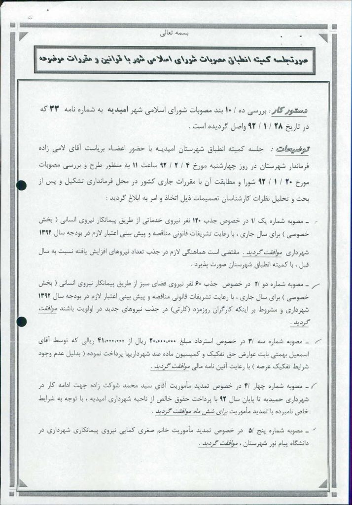 نظریه هیأت تطبیق جلسه شماره ۱۵۵ مورخ ۹۲/۱/۲۰ شورای اسلامی شهر امیدیه