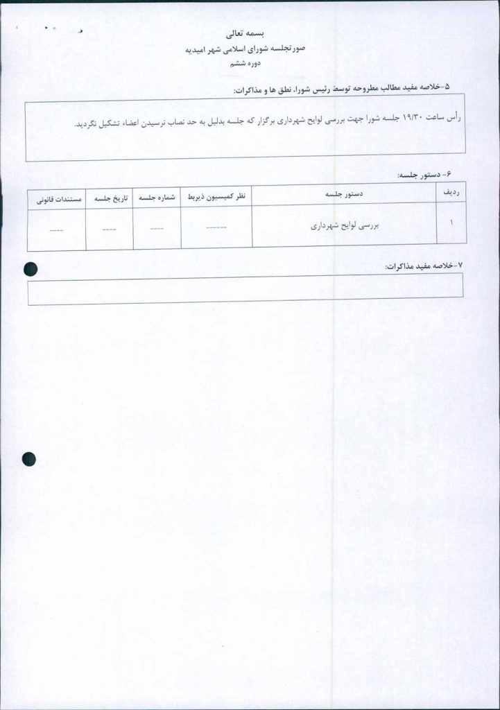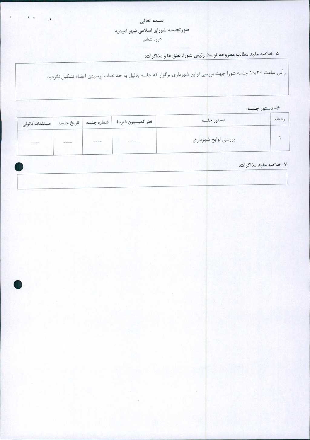 رأس ساعت ۳۰/ ۱۹ جلسه شورا جهت بررسی لوایح شهرداری برگزار که جلسه بدلیل به حد نصاب نرسیدن اعضاء تشکیل نگردید.