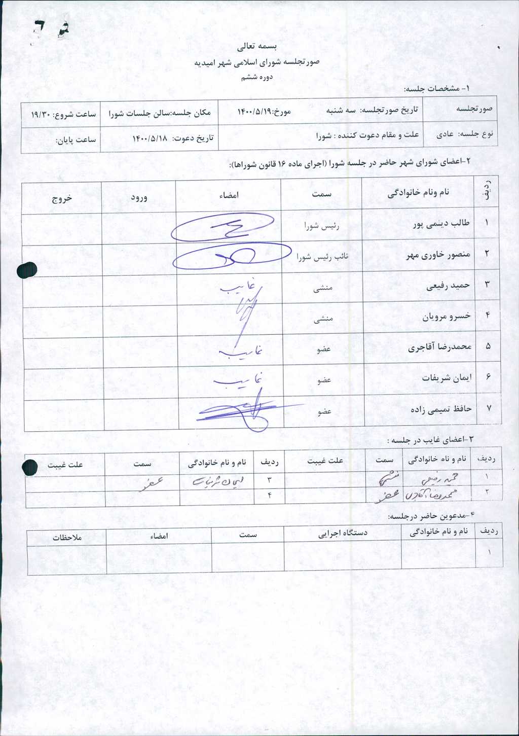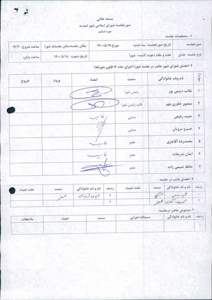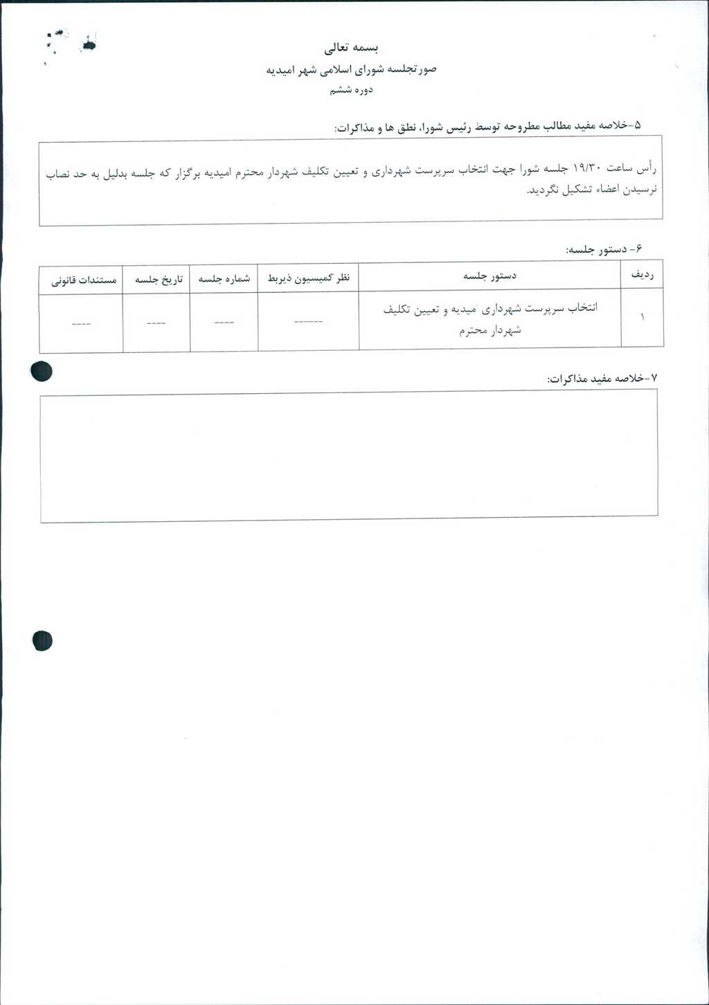 رأس ساعت ۳۰/ ۱۹ جلسه شورا جهت انتخاب سرپرست شهرداری و تعیین تکلیف شهردار محترم امیدیه برگزار که جلسه بدلیل به حد نصاب نرسیدن اعضاء تشکیل نگردید.