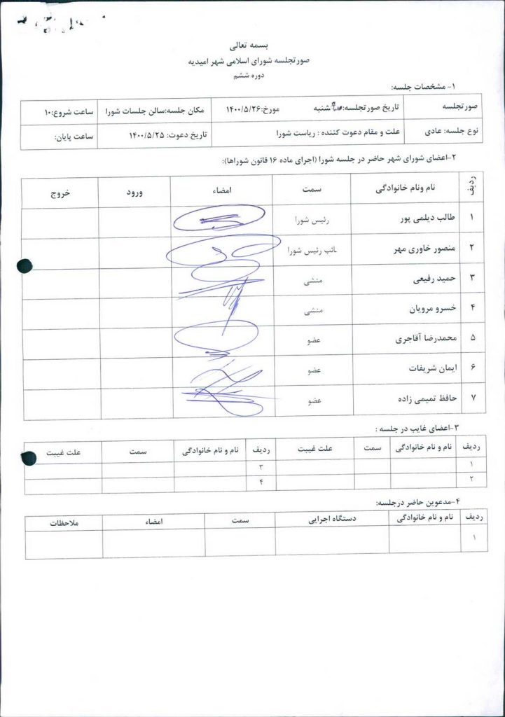 گزارش جلسه مورخ ۱۴۰۰/۵/۲۶ شورای اسلامی شهر امیدیه