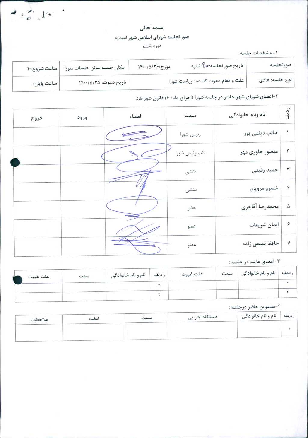 مقرر گردید بر اساس دستور جلسه مورخه ۲۶/ ۵/ ۱۴۰۰با حضور ۷ عضو محترم شورا پس از پایان بررسی شاخص های انتخاب شهردار اقدام به بازگشایی پاکت های حاوی رزومه کاندیدهای واجد شرایط احراز سمت شهرداری طبق آئین نامه احراز شرایط تصدی سمت شهردار صادره وزارت کشور هر کاندید به مدت یک ساعت و نیم در تاریخ های ۳۰ و ۳۱/ ۵/ ۱۴۰۰ طبق زمان بندی مشخص ارائه برنامه نمایند و پس از اتمام مصاحبه ها شورا جهت انتخاب شهردار و تعیین سرپرست با حضور اعضاء محترم تشکیل جلسه دهد.