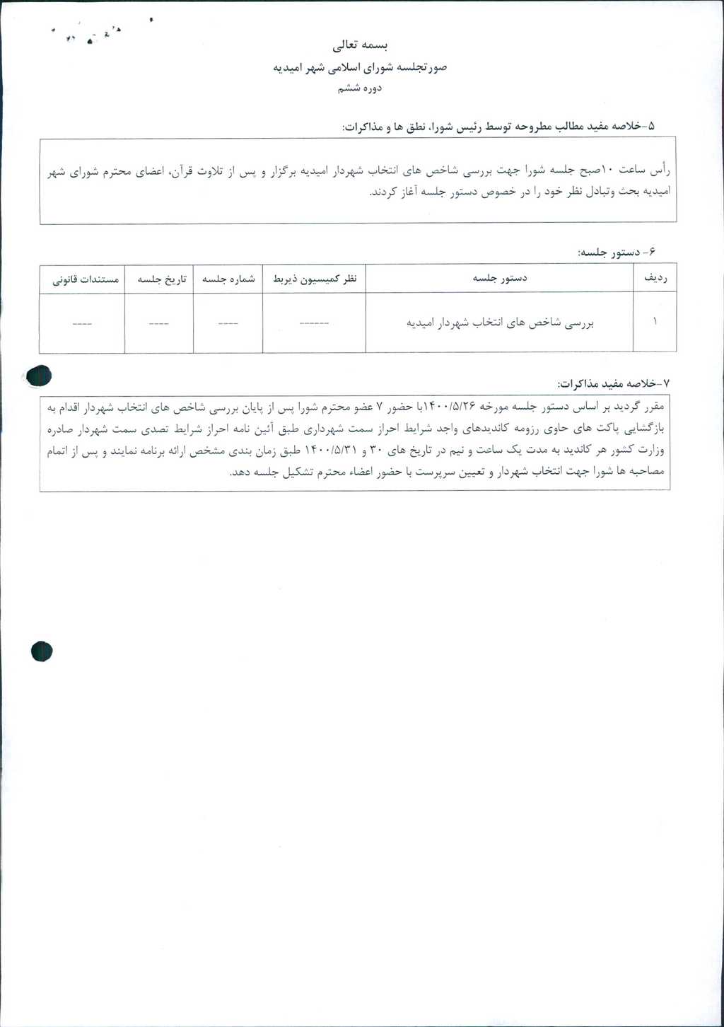 دستور جلسه: بررسی شاخص های انتخاب شهردار امیدیه