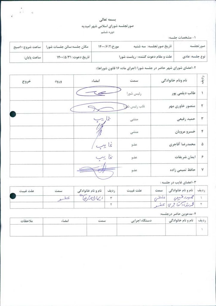 بسم الله الرحمن الرحیم گزارش جلسه مورخ ۱۴۰۰/۶/۲ شورای اسلامی شهر امیدیه