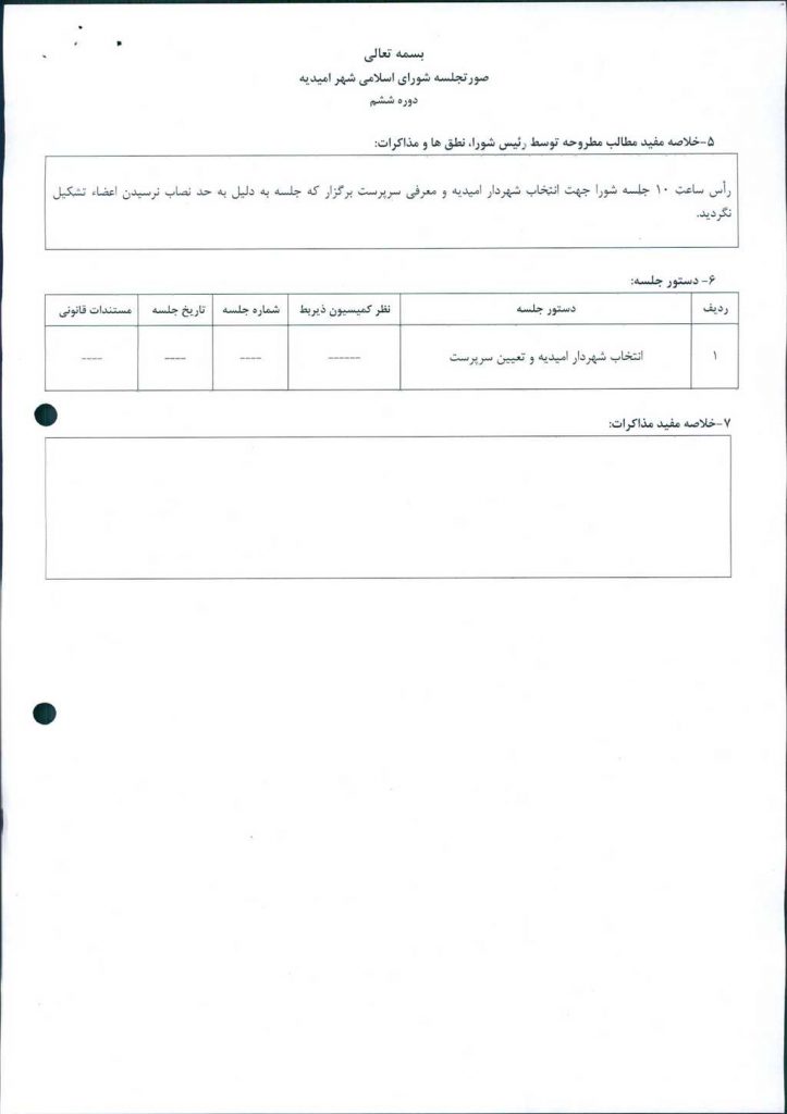 رأس ساعت ۱۰ جلسه شورا جهت انتخاب شهردار امیدیه و معرفی سرپرست برگزار که جلسه به دلیل به حد نصاب نرسیدن اعضاء تشکیل نگردید.