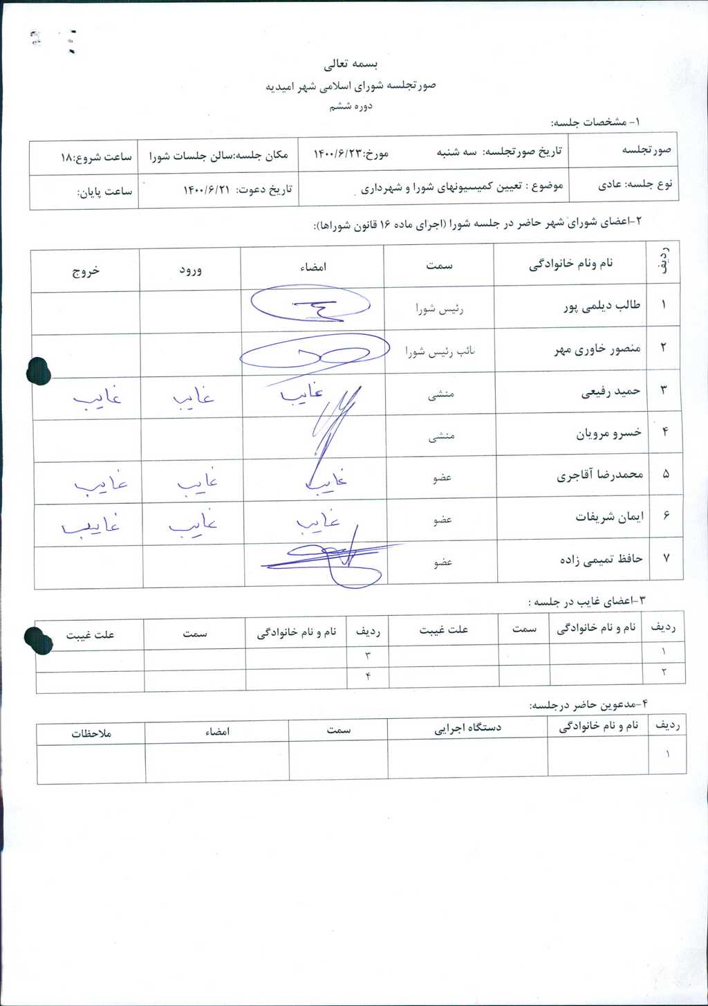 بسم الله الرحمن الرحیم گزارش جلسه مورخ ۱۴۰۰/۶/۲۳ شورای اسلامی شهر امیدیه