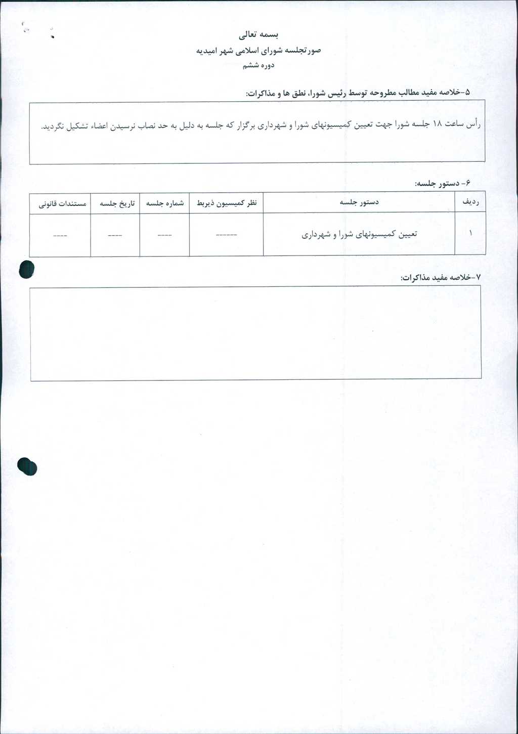 رأس ساعت ۱۸ جلسه شورا جهت تعیین کمیسیونهای شورا و شهرداری برگزار که جلسه به دلیل به حد نصاب نرسیدن اعضاء تشکیل نگردید.