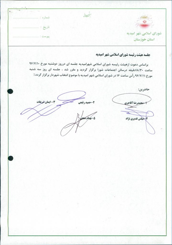 براساس دعوت ازهیئت رئیسه شورای اسلامی شهر امیدیه جلسه ای درروز دوشنبه مورخ ۱۰/۷/۹۶ ساعت ۳۰/۱۸دقیقه درسالن اجتماعات شورا برگزار گردید و مقرر شد ، جلسه ای روز سه شنبه مورخ ۱۱/۷/۹۶ رأس ساعت ۱۶ در شورای اسلامی شهر امیدیه با موضوع انتخاب شهردار برگزار گردد%