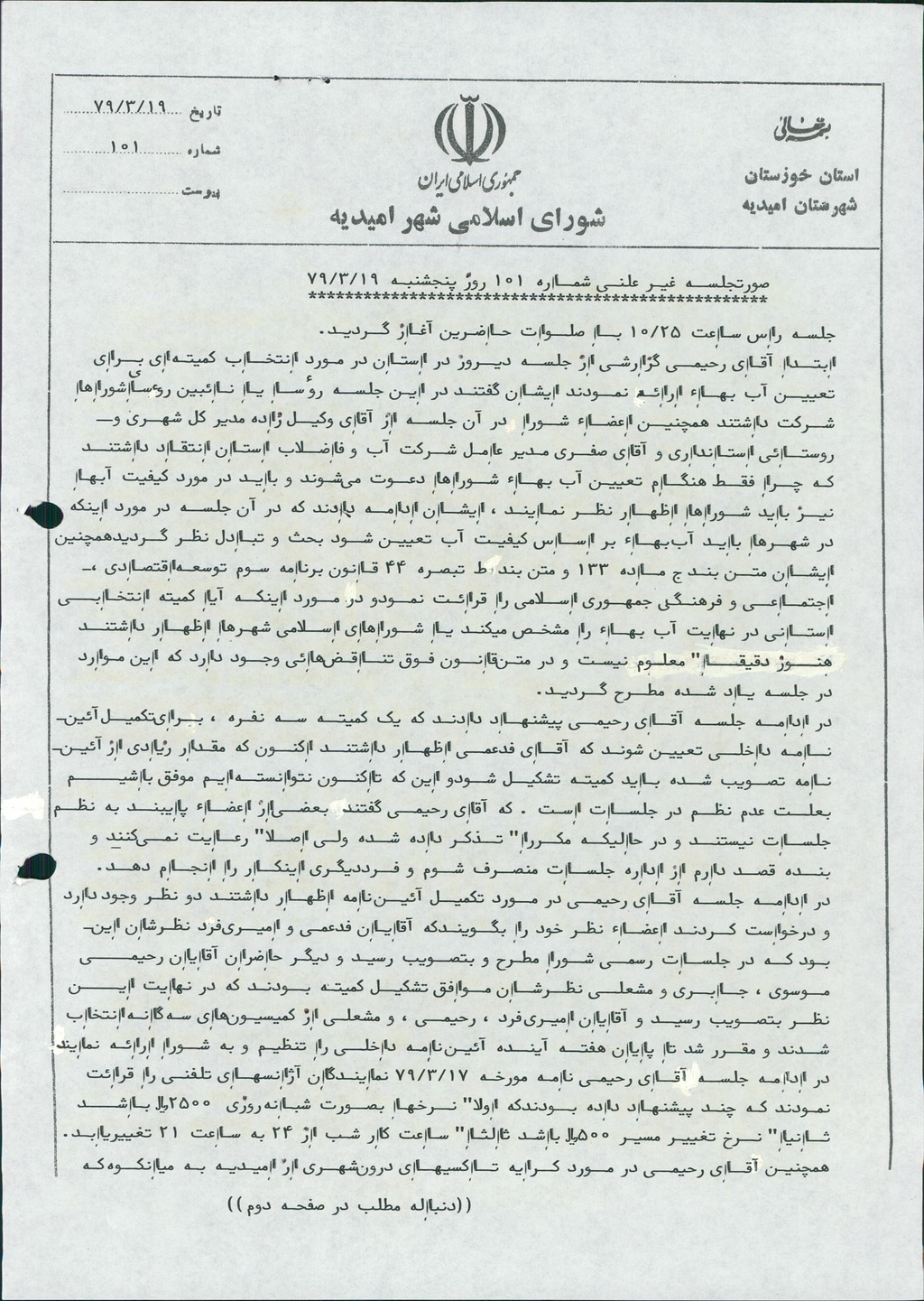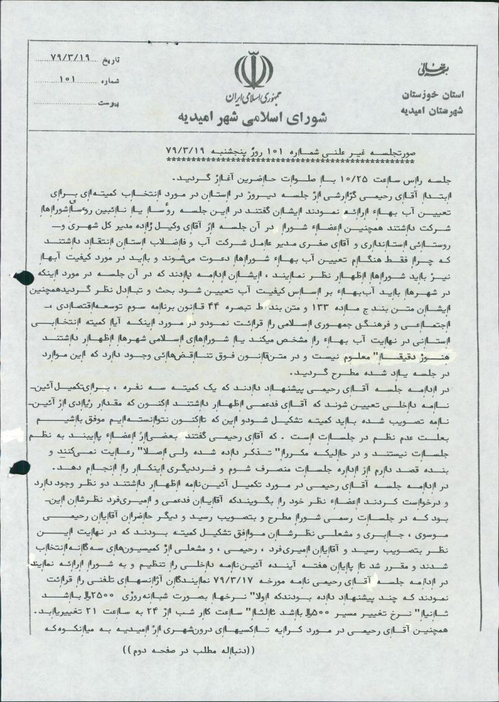گزارش جلسه شماره ۱۰۱ شورای اسلامی شهر امیدیه