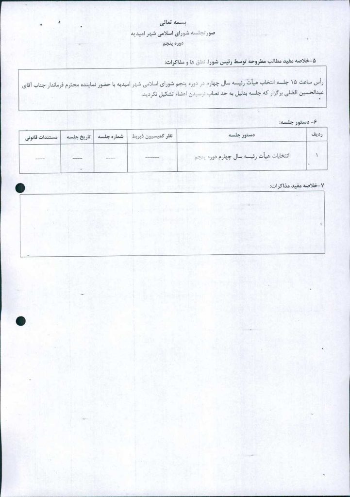 رأس ساعت ۱۵ جلسه انتخاب هیأت رئیسه سال چهارم در دوره پنجم شورای اسلامی شهر امیدیه با حضور نماینده محترم فرماندار جناب آقای عبدالحسین افضلی برگزار که جلسه بدلیل به حد نصاب نرسیدن اعضاء تشکیل نگردید.