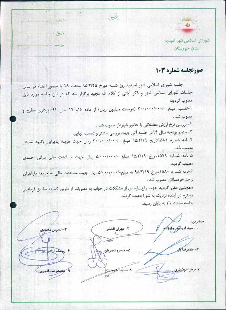 گزارش جلسه شماره ۱۰۳ شورای اسلامی شهر امیدیه