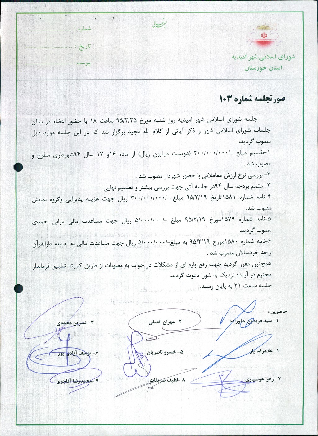 جلسه شورای اسلامی شهر امیدیه روز شنبه مورخ ۲۵/۲/۹۵ ساعت ۱۸ با حضور اعضاء در سالن جلسات شورای اسلامی شهر و ذکر آیاتی از کلام الله مجید برگزار شد که در این جلسه موارد ذیل مصوب گردید: