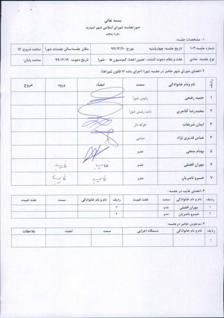 گزارش جلسه شماره ۱۰۳ مورخ ۹۹/۱۲/۲۰ شورای اسلامی شهر امیدیه