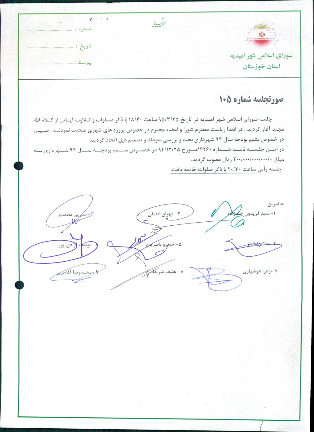 جلسه شورای اسلامی شهر امیدیه در تاریخ ۲۵/۳/۹۵ ساعت ۳۰/۱۸ با ذکر صلوات و تلاوت آیاتی از کلام الله مجید آغاز گردید ، در ابتدا ریاست محترم شورا و اعضاء محترم در خصوص پروژه های شهری صحبت نمودند ، سپس در خصوص متمم بودجه سال ۹۴ شهرداری بحث و بررسی نمودند و تصمیم ذیل اتخاذ گردید: