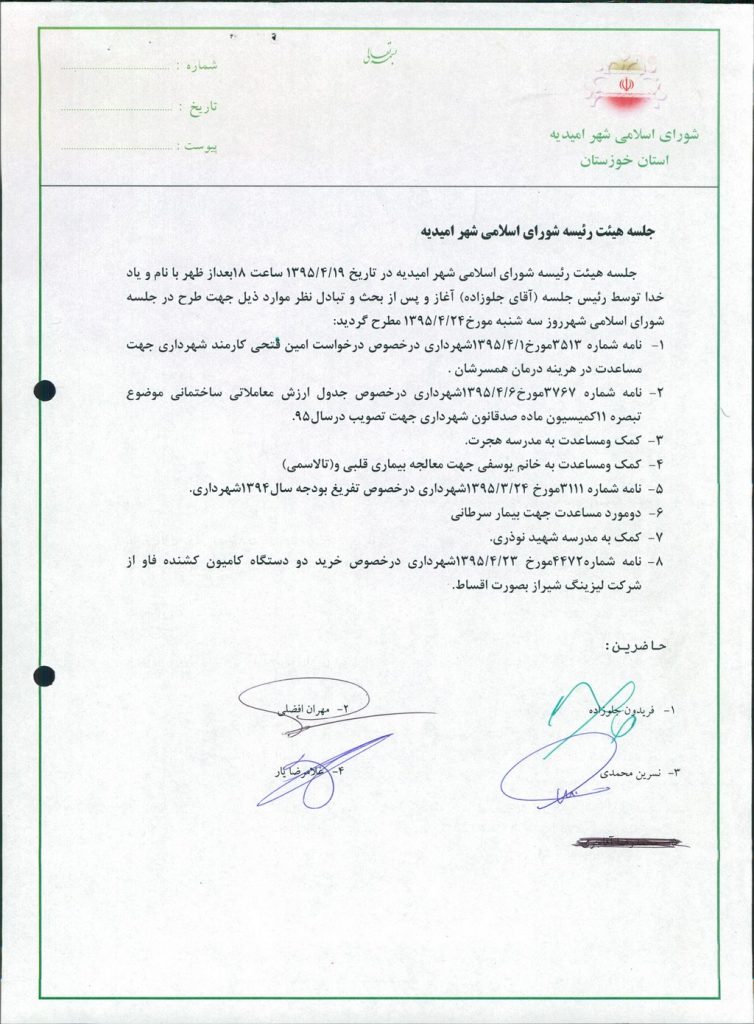• نامه شماره ۳۵۱۳مورخ۱/۴/۱۳۹۵شهرداری درخصوص درخواست امین فتحی کارمند شهرداری جهت مساعدت در هرینه درمان همسرشان .