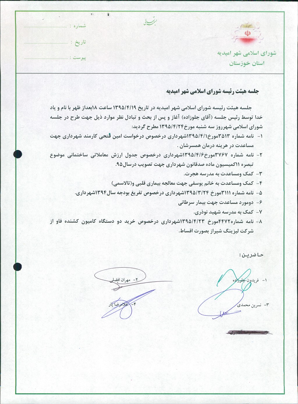 گزارش جلسه شماره ۱۰۸ مورخ ۹۵/۴/۱۹ هیئت رئیسه شورای اسلامی شهر امیدیه