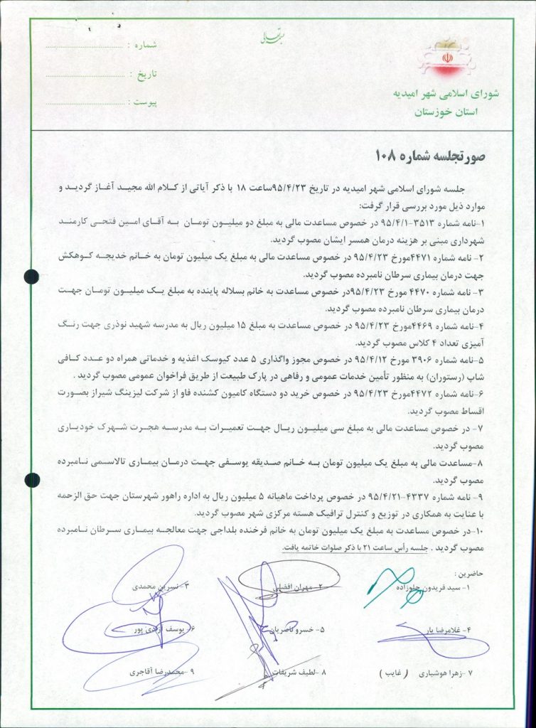 گزارش جلسه شماره ۱۰۸ مورخ ۹۵/۴/۲۳ شورای اسلامی شهر امیدیه