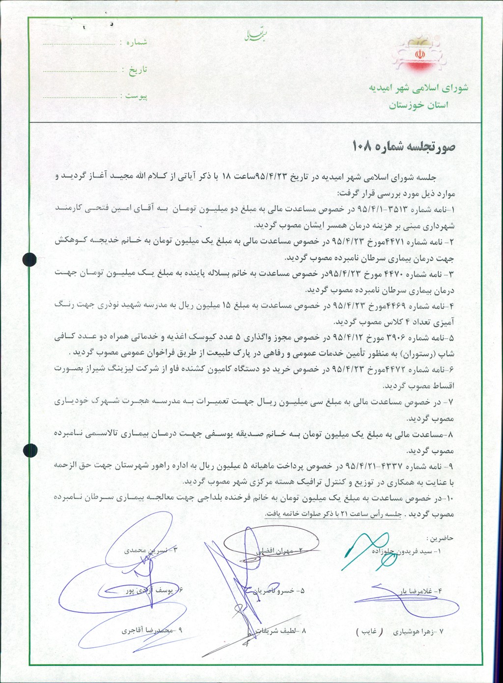 ۱۰-در خصوص مساعدت به مبلغ یک میلیون تومان به خانم فرخنده بلداجی جهت معالجه بیماری سرطان نامبرده مصوب گردید . جلسه رأس ساعت ۲۱ با ذکر صلوات خاتمه یافت.