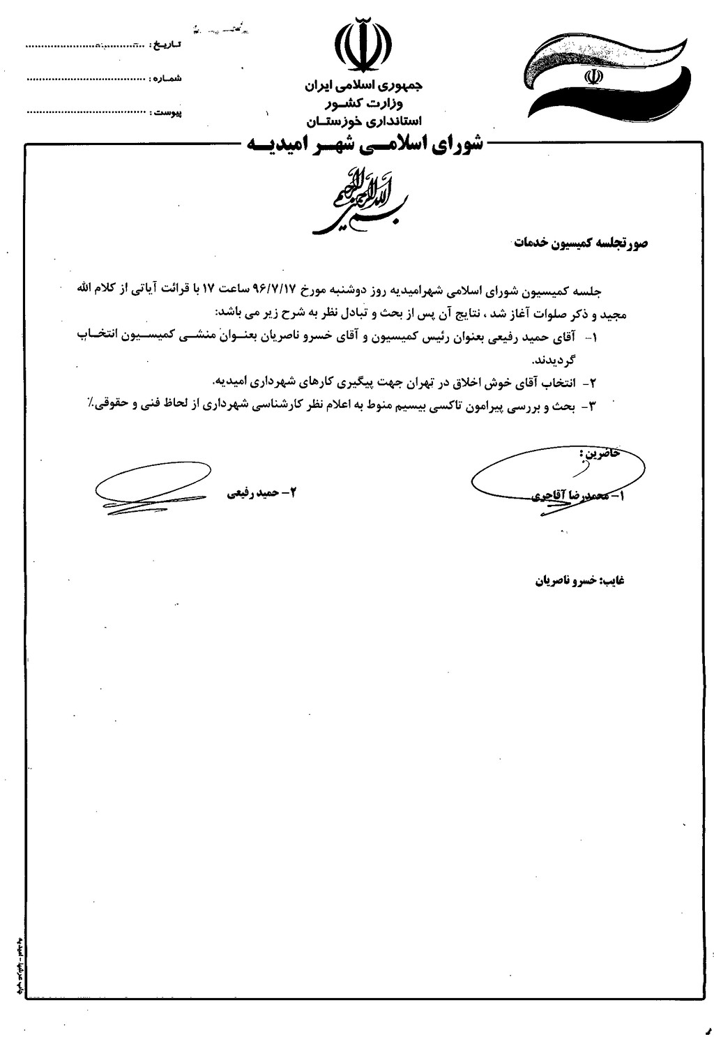 جلسه کمیسیون شورای اسلامی شهرامیدیه روز دوشنبه مورخ ۱۷/۷/۹۶ ساعت ۱۷ با قرائت آیاتی از کلام الله مجید و ذکر صلوات آغاز شد ، نتایج آن پس از بحث و تبادل نظر به شرح زیر می باشد: