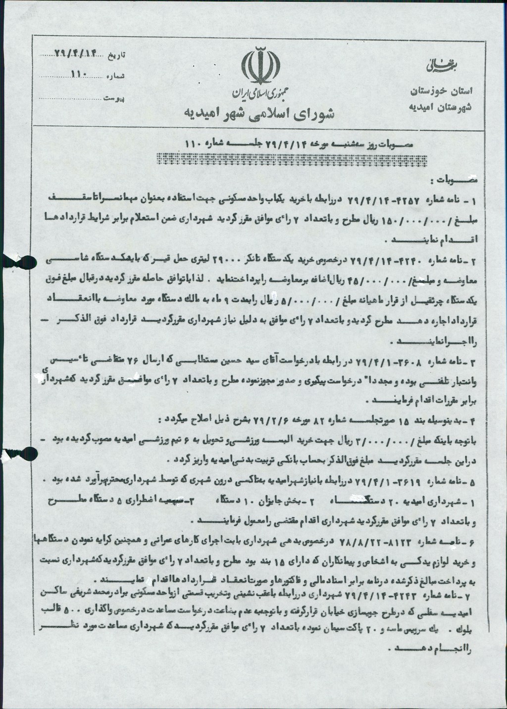 گزارش جلسه شماره ۱۱۰ مورخ ۷۹/۴/۱۴ شورای اسلامی شهر امیدیه
