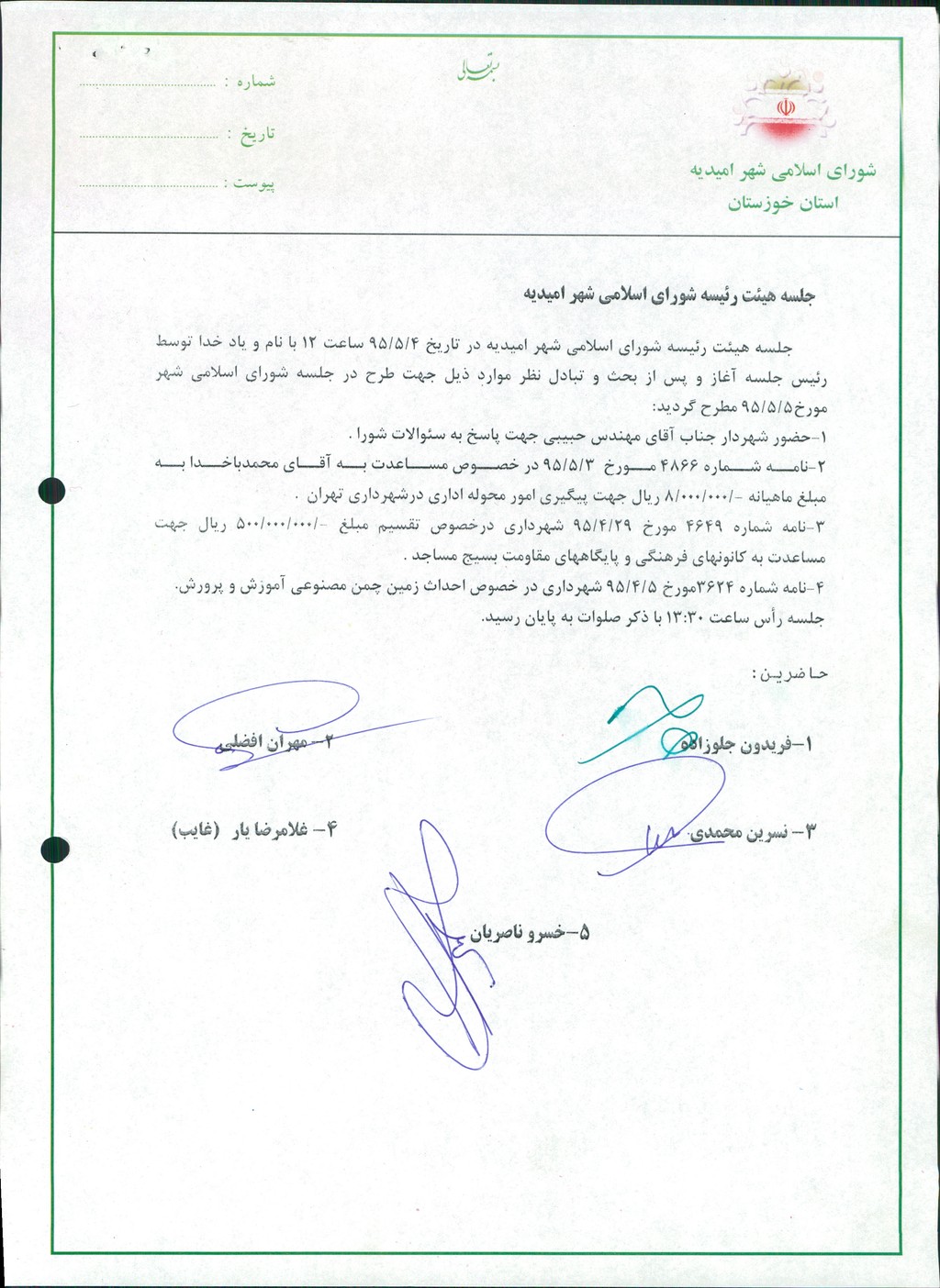 گزارش جلسه شماره ۱۱۰ مورخ ۹۵/۵/۴ هیئت رئیسه شورای اسلامی شهر امیدیه