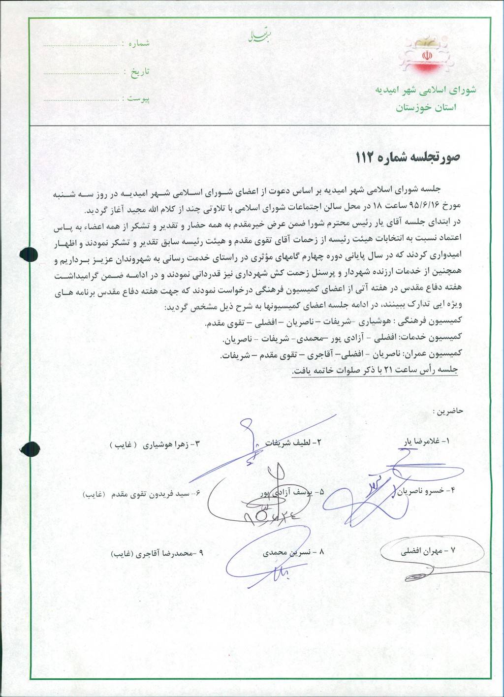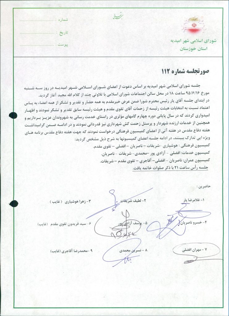 گزارش جلسه شماره ۱۱۲ شورای اسلامی شهر امیدیه