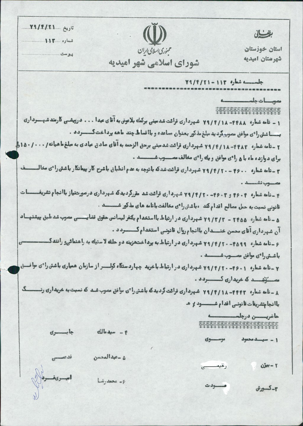 نامه شماره ۲۴۵۵ مورخ ۳/۳/ ۷۹ شهرداري در ارتباط با استخدام يك نفر ليسانس حقوق قضاي مصوب شد طبق پيشنهاد آن شهرداري آقاي محسن خندان با انجام روال قانوني استخدام گردد.