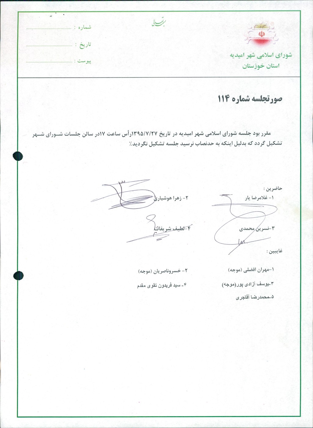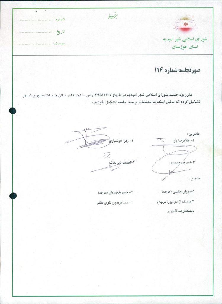 مقرر بود جلسه شورای اسلامی شهر امیدیه در تاریخ ۲۷/۷/۱۳۹۵رأس ساعت ۱۷در سالن جلسات شورای شهر تشکیل گردد که بدلیل اینکه به حدنصاب نرسید جلسه تشکیل نگردید%