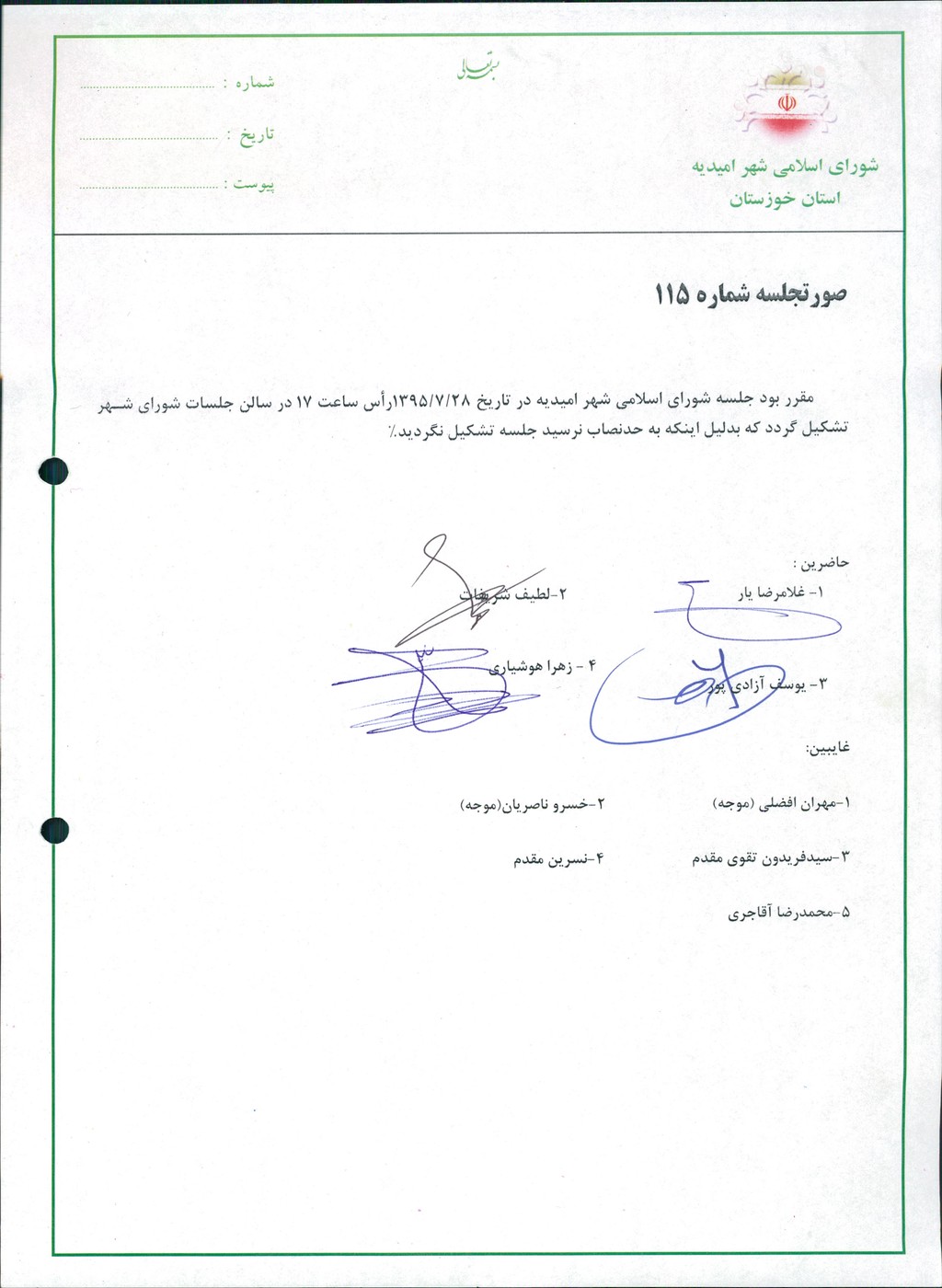مقرر بود جلسه شورای اسلامی شهر امیدیه در تاریخ ۲۸/۷/۱۳۹۵رأس ساعت ۱۷ در سالن جلسات شورای شهر تشکیل گردد که بدلیل اینکه به حدنصاب نرسید جلسه تشکیل نگردید%