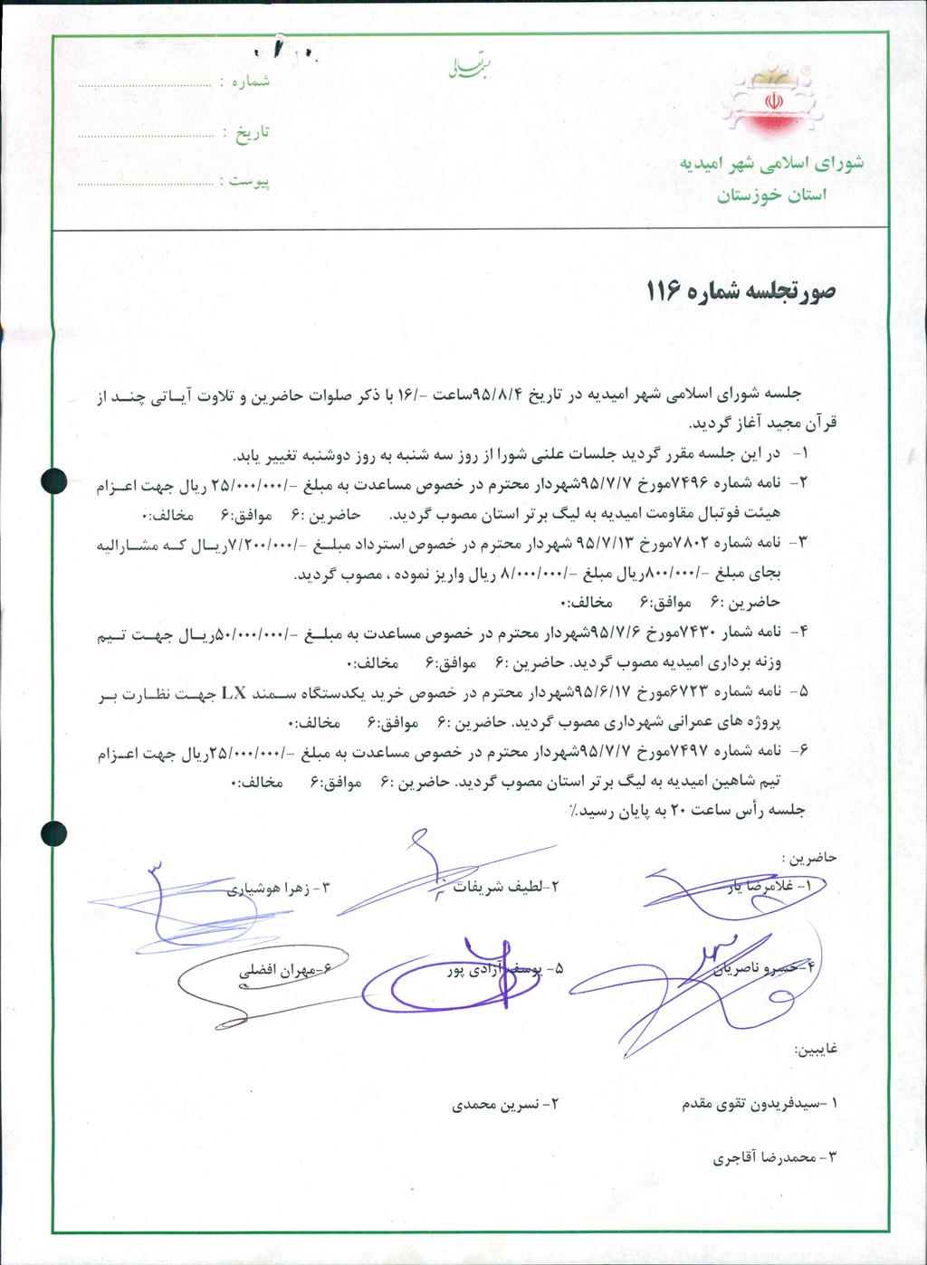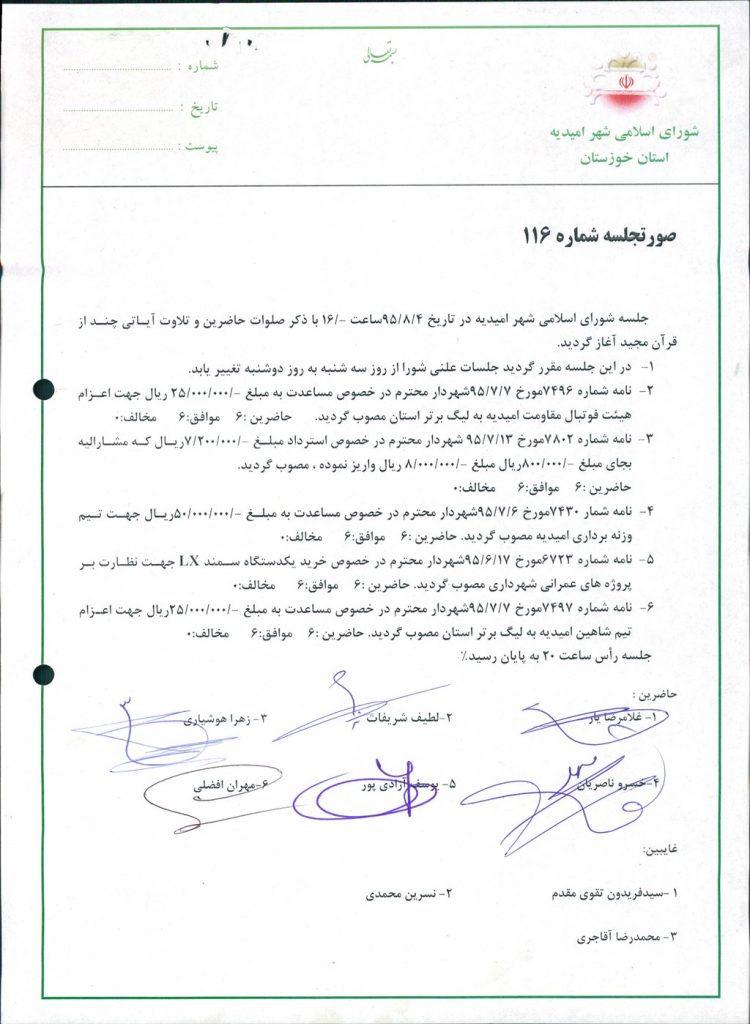 - نامه شماره ۷۴۹۷مورخ ۷/۷/۹۵شهردار محترم در خصوص مساعدت به مبلغ ۲۵۰۰۰۰۰۰ ریال جهت اعزام تیم شاهین امیدیه به لیگ برتر استان مصوب گردید. حاضرین :۶ موافق:۶ مخالف:۰