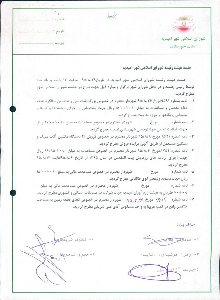 جلسه هیئت رئیسه شورای اسلامی شهر امیدیه در تاریخ۲۹/۸/۹۵ساعت ۱۳ با نام و یاد خدا توسط رئیس جلسه و در محل شورای شهر برگزار و موارد ذیل جهت طرح در جلسه شورای اسلامی شهر مطرح گردید: