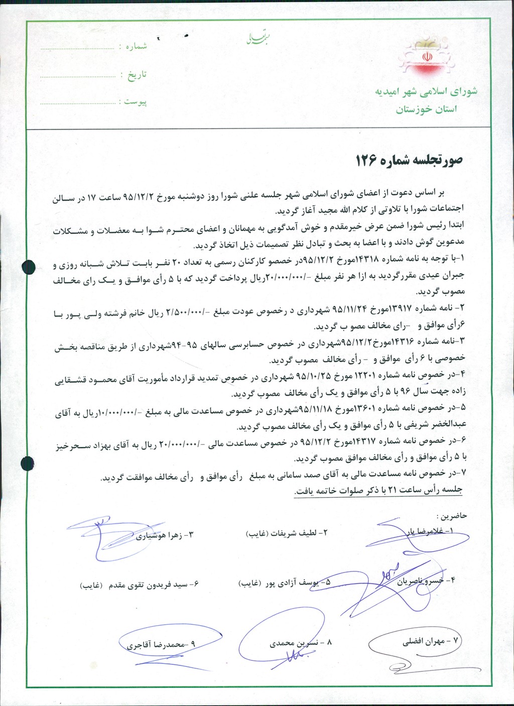 گزارش جلسه شماره ۱۲۶ مورخ ۹۵/۱۲/۲ شورای اسلامی شهر امیدیه