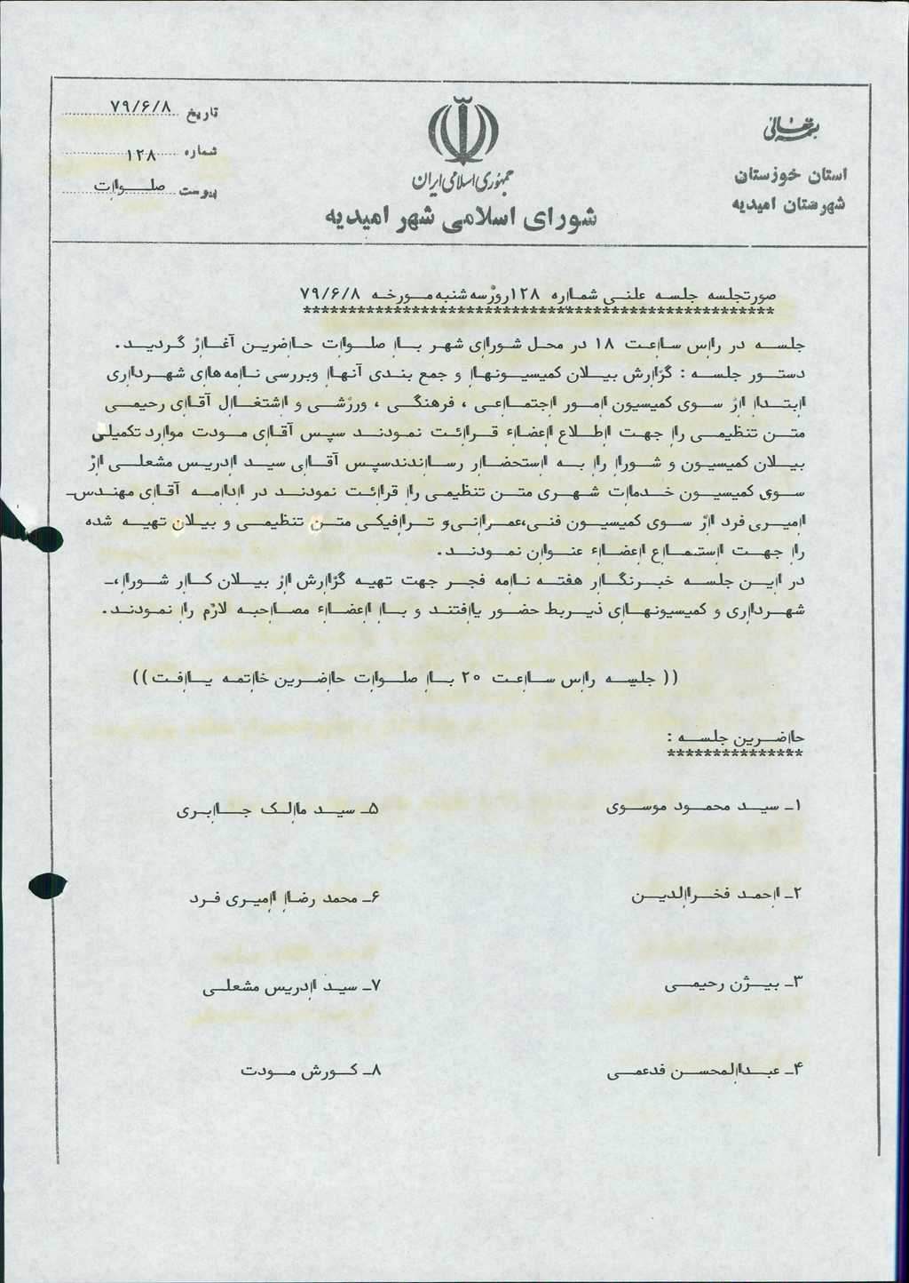 گزارش جلسه شماره ۱۲۸ شورای اسلامی شهر امیدیه