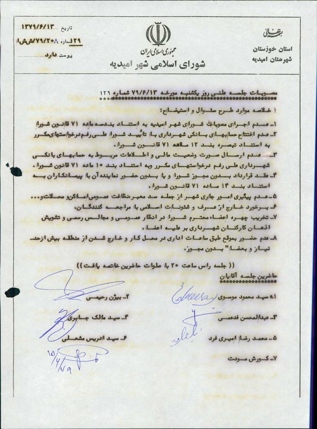 - عدم اجرای مصوبات شورای شهر امیدیه به استناد بند سه ماده ۷۱ قانون شورا .