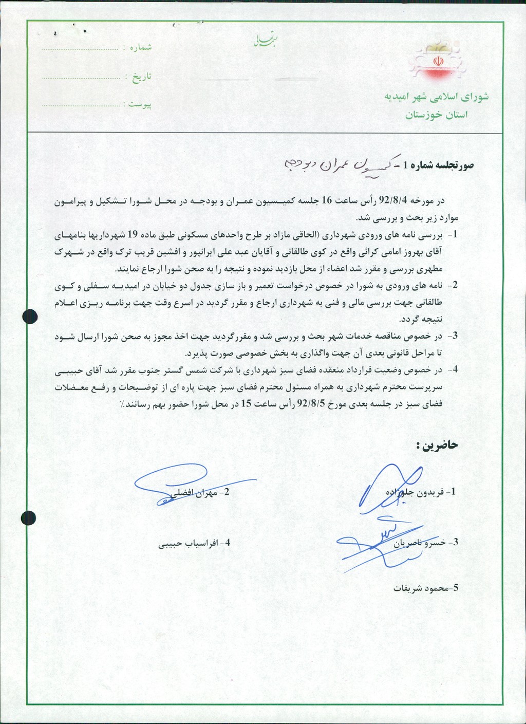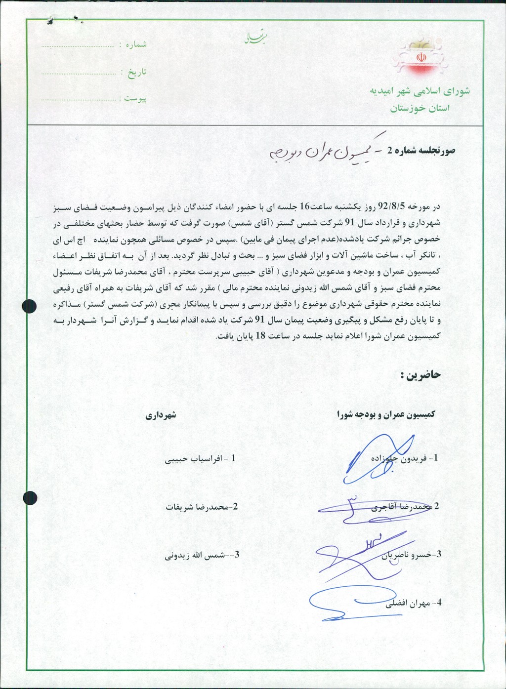 در مورخه ۵/۸/۹۲ روز یکشنبه ساعت۱۶ جلسه ای با حضور امضاء کنندگان ذیل پیرامون وضعیت فضای سبز شهرداری و قرارداد سال ۹۱ شرکت شمس گستر (آقای شمس) صورت گرفت که توسط حضار بحثهای مختلفی در خصوص جرائم شرکت یادشده(عدم اجرای پیمان فی مابین) .سپس در خصوص مسائلی همچون نماینده  اچ اس ای  تانکر آب ، ساخت ماشین آلات و ابزار فضای سبز و … بحث و تبادل نظر گردید. بعد از آن  به اتفاق نظر اعضاء کمیسیون عمران و بودجه و مدعوین شهرداری ( آقای حبیبی سرپرست محترم ، آقای محمدرضا شریفات مسئول محترم فضای سبز و آقای شمس الله زیدونی نماینده محترم مالی ) مقرر شد که آقای شریفات به همراه آقای رفیعی نماینده محترم حقوقی شهرداری موضوع را دقیق بررسی و سپس با پیمانکار مجری (شرکت شمس گستر) مذاکره و تا پایان رفع مشکل و پیگیری وضعیت پیمان سال ۹۱ شرکت یاد شده اقدام نماید و گزارش آنرا  شهردار به کمیسیون عمران شورا اعلام نماید جلسه در ساعت ۱۸ پایان یافت.