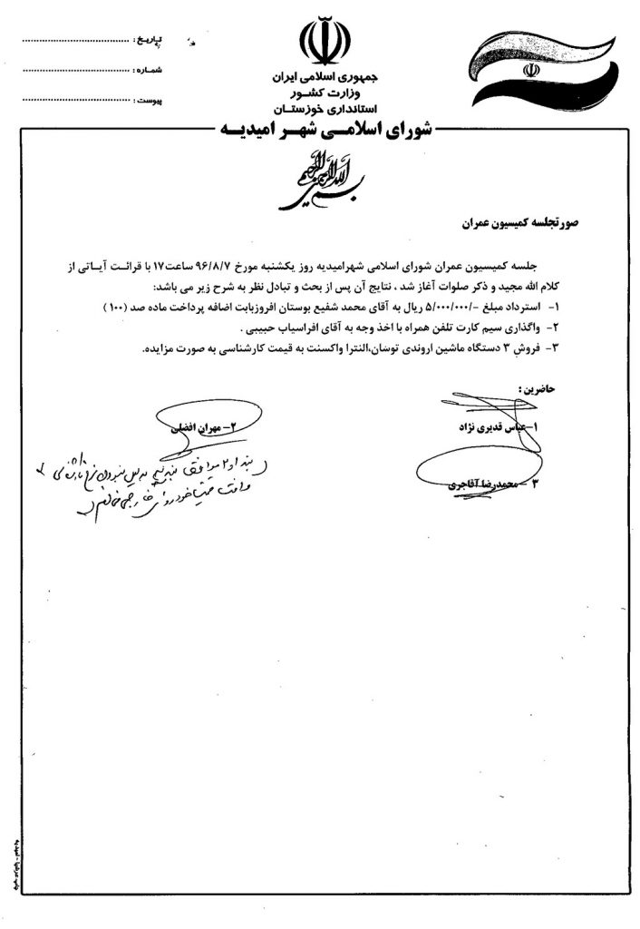 جلسه کمیسیون عمران شورای اسلامی شهرامیدیه روز یکشنبه مورخ ۹۶/۸/۷ ساعت ۱۷ با قرائت آیاتی از کلام الله مجید و ذکر صلوات آغاز شد ، نتایج آن پس از بحث و تبادل نظر به شرح زیر می باشد: