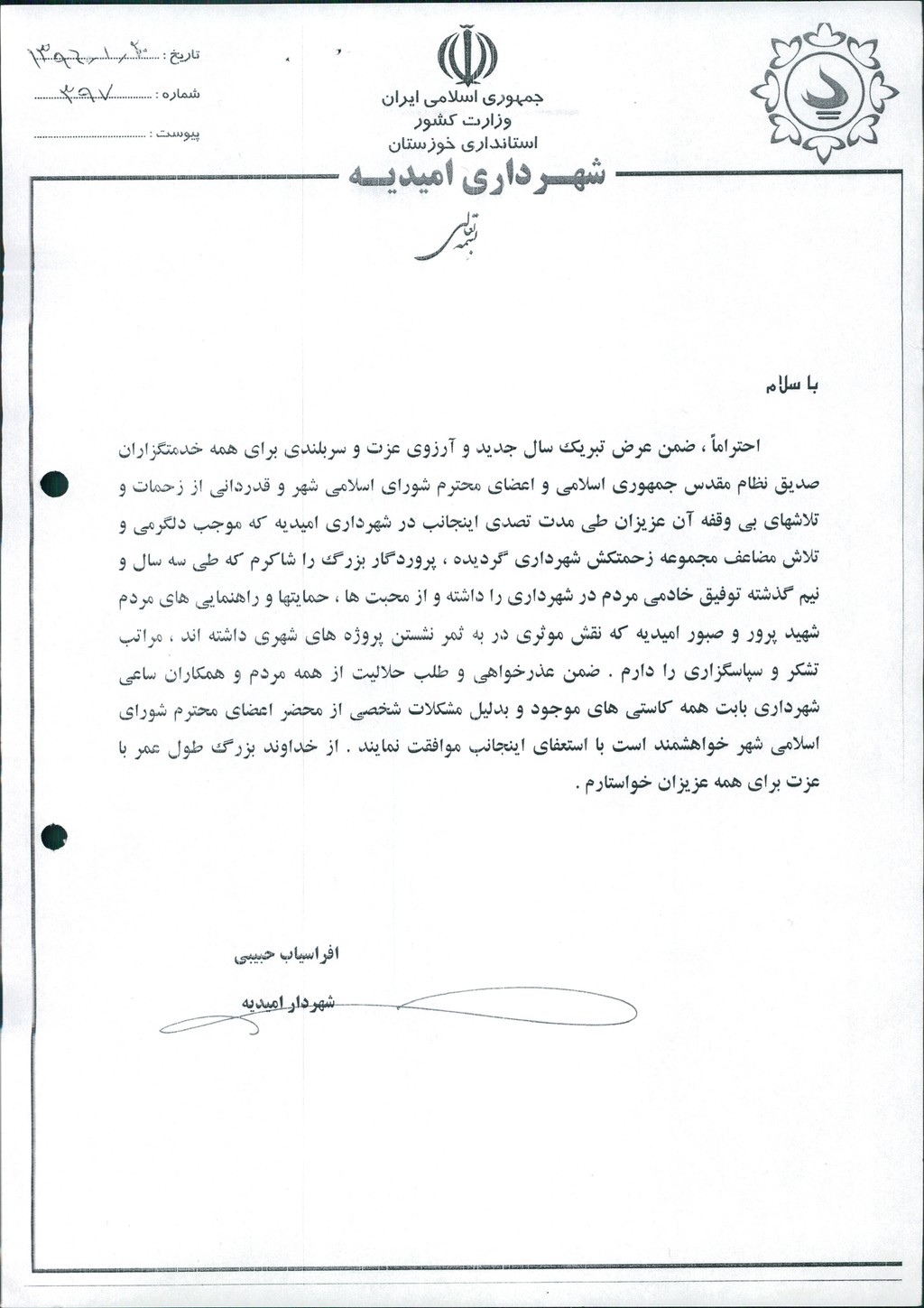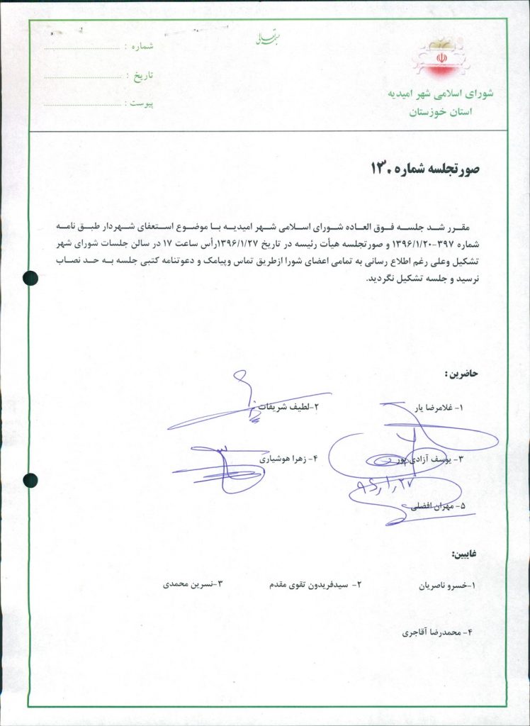 مقرر شد جلسه فوق العاده شورای اسلامی شهر امیدیه با موضوع استعفای شهردار طبق نامه شماره ۳۹۷-۲۰/۱/۱۳۹۶ و صورتجلسه هیأت رئیسه در تاریخ ۲۷/۱/۱۳۹۶رأس ساعت ۱۷ در سالن جلسات شورای شهر تشکیل وعلی رغم اطلاع رسانی به تمامی اعضای شورا ازطریق تماس وپیامک و دعوتنامه کتبی جلسه به حد نصاب نرسید و جلسه تشکیل نگردید.