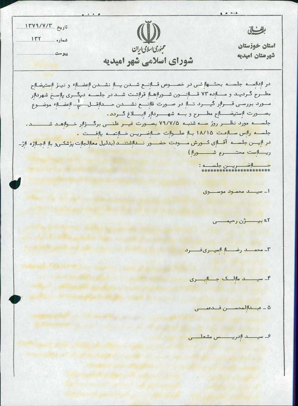 در این جلسه آقای کورش مودت حضور نداشتند(به دلیل معالجات پزشک و با اجازه از ریاست محترم شورا)