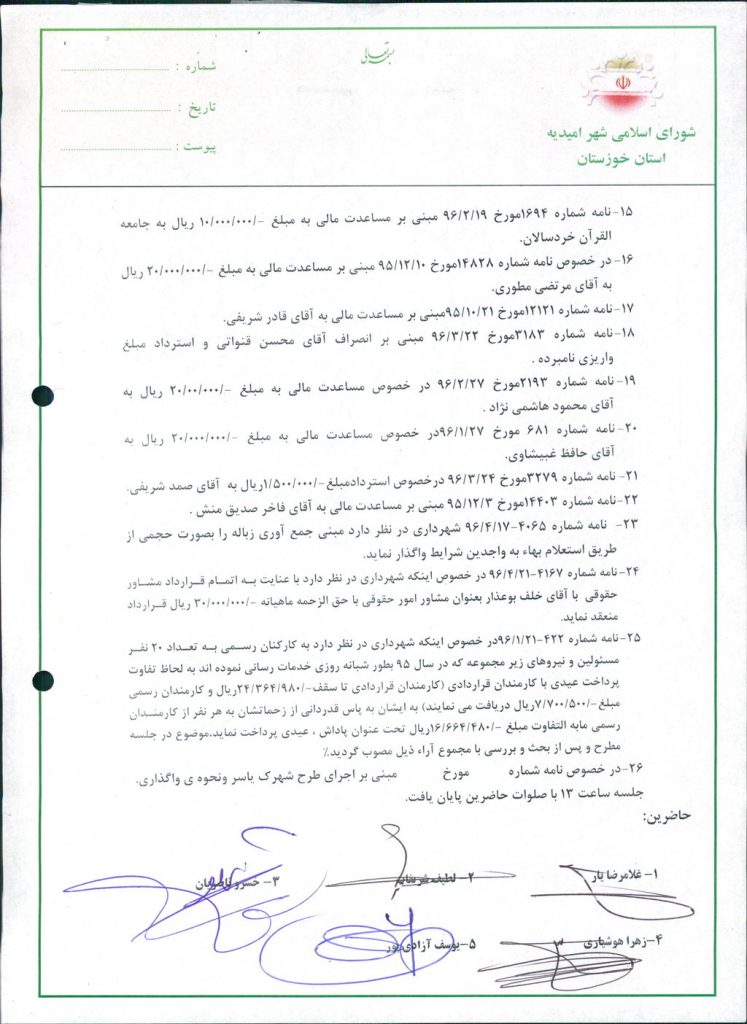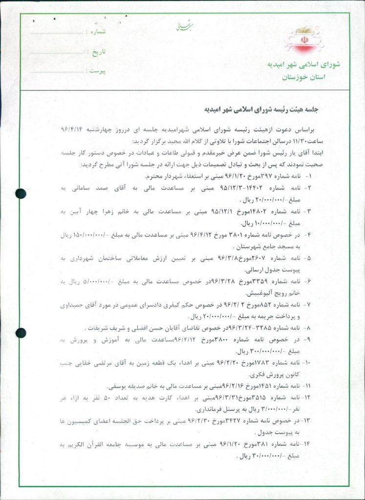 - نامه شماره ۱۴۴۰۲-۳/۱۲/۹۵ مبنی بر مساعدت مالی به آقای صمد سامانی به مبلغ۲۰۰۰۰۰۰۰ ریال .