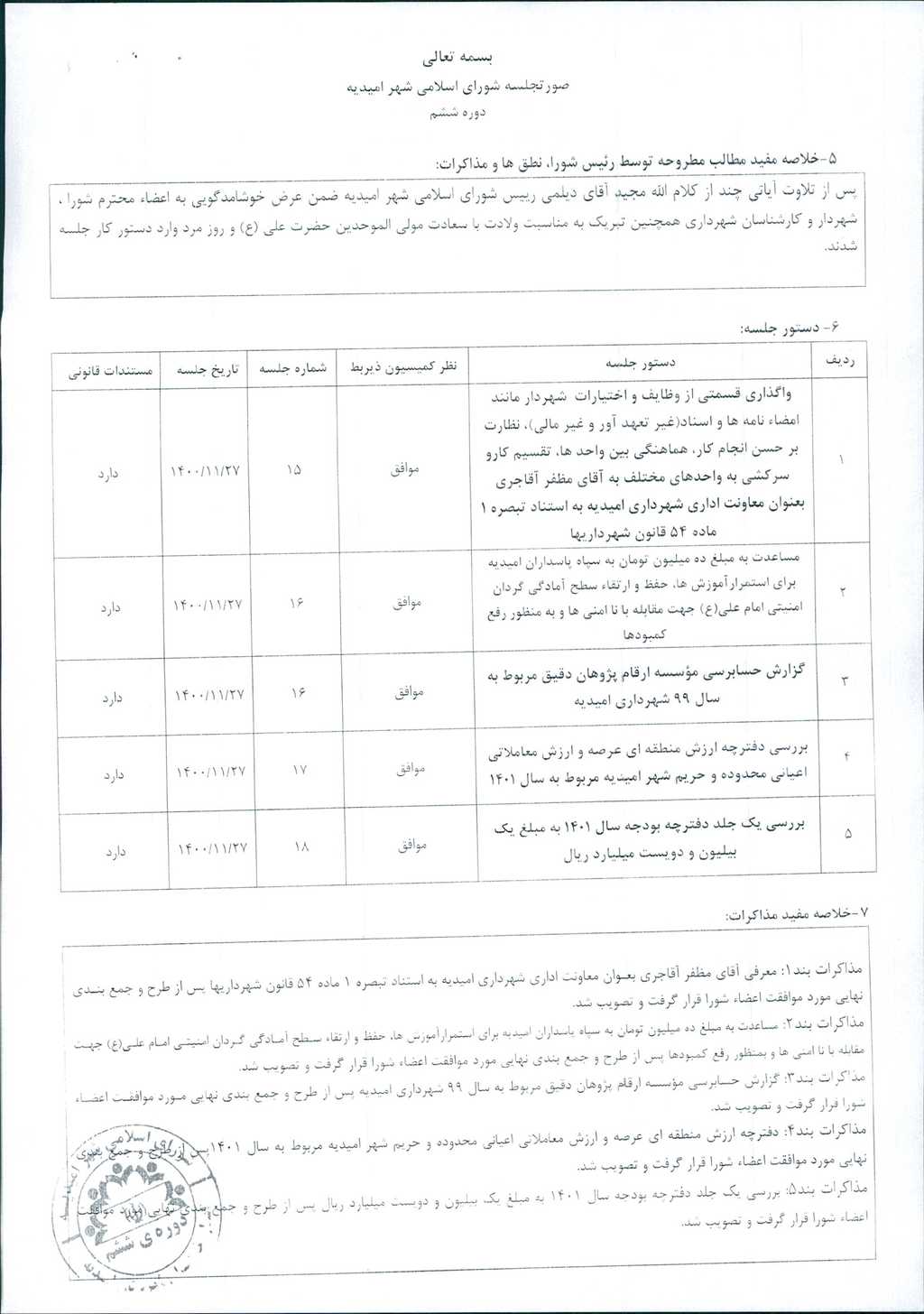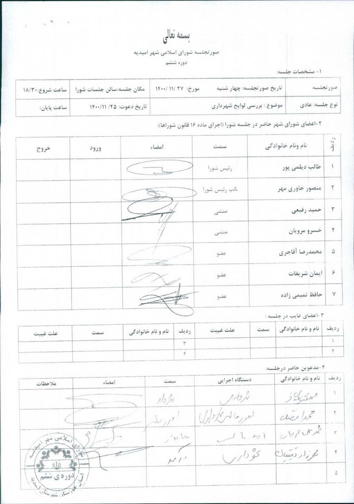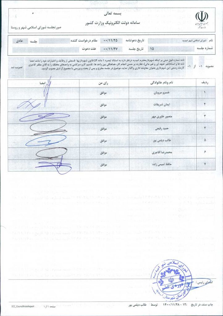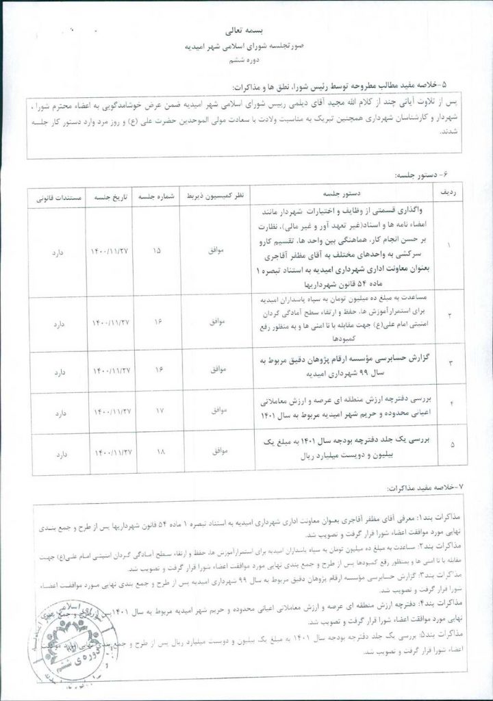 مذاکرات بند۱: معرفی آقای مظفر آقاجری بعنوان معاونت اداری شهرداری امیدیه به استناد تبصره ۱ ماده ۵۴ قانون شهرداریها پس از طرح و جمع بندی نهایی مورد موافقت اعضاء شورا قرار گرفت و تصویب شد.