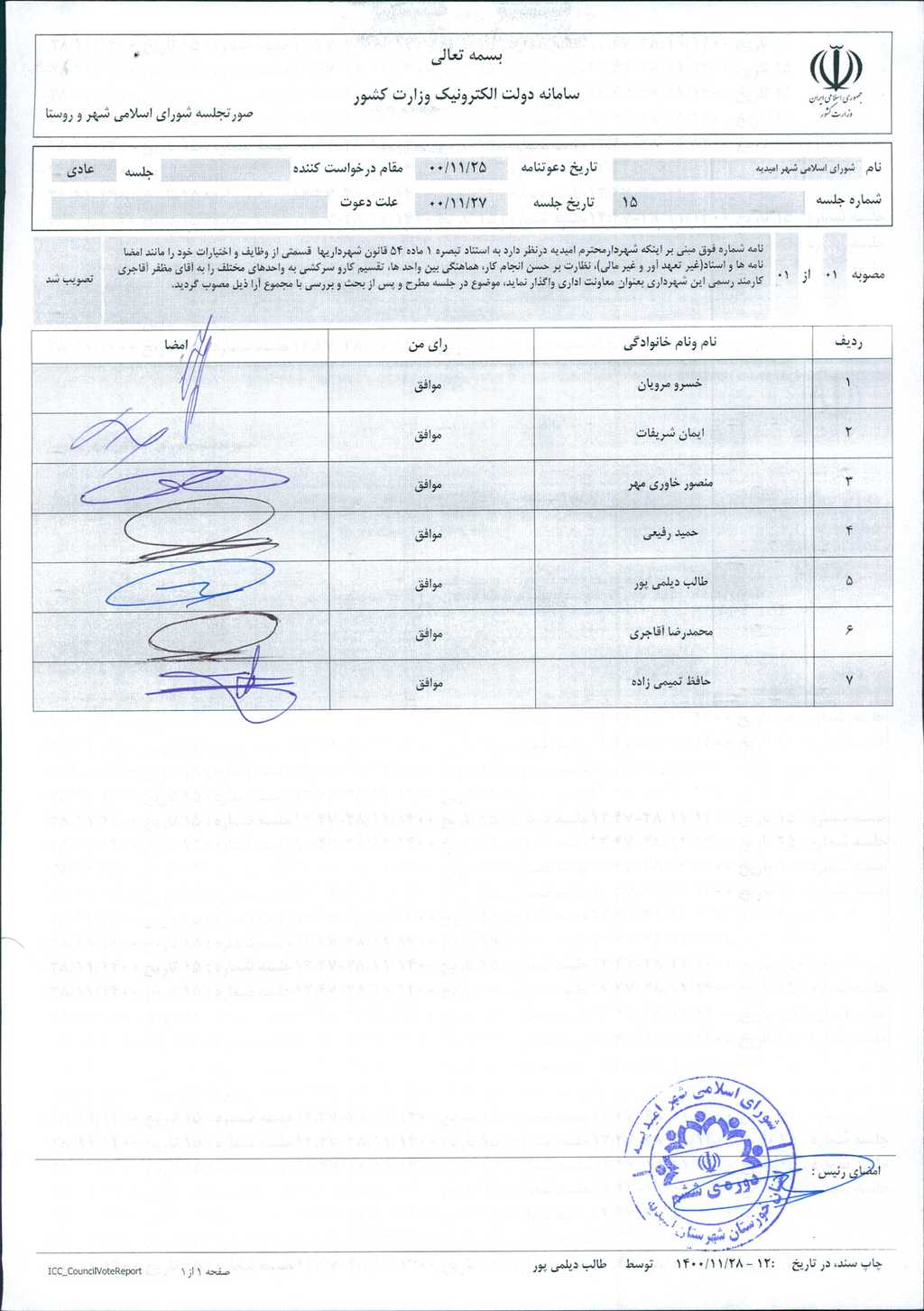 گزارش جلسه شماره ۱۵ مورخ ۱۴۰۰/۱۱/۲۷ شورای اسلامی شهر امیدیه