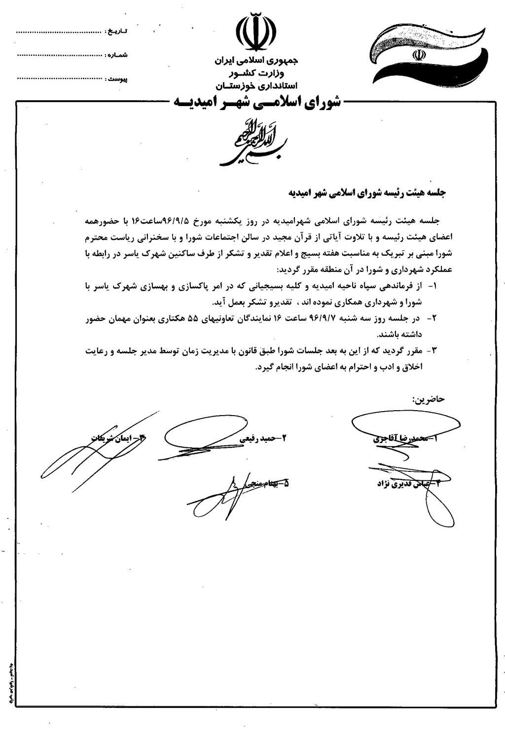گزارش جلسه شماره ۱۵ مورخ ۹۶/۹/۵ هیئت رئیسه شورای اسلامی شهر امیدیه