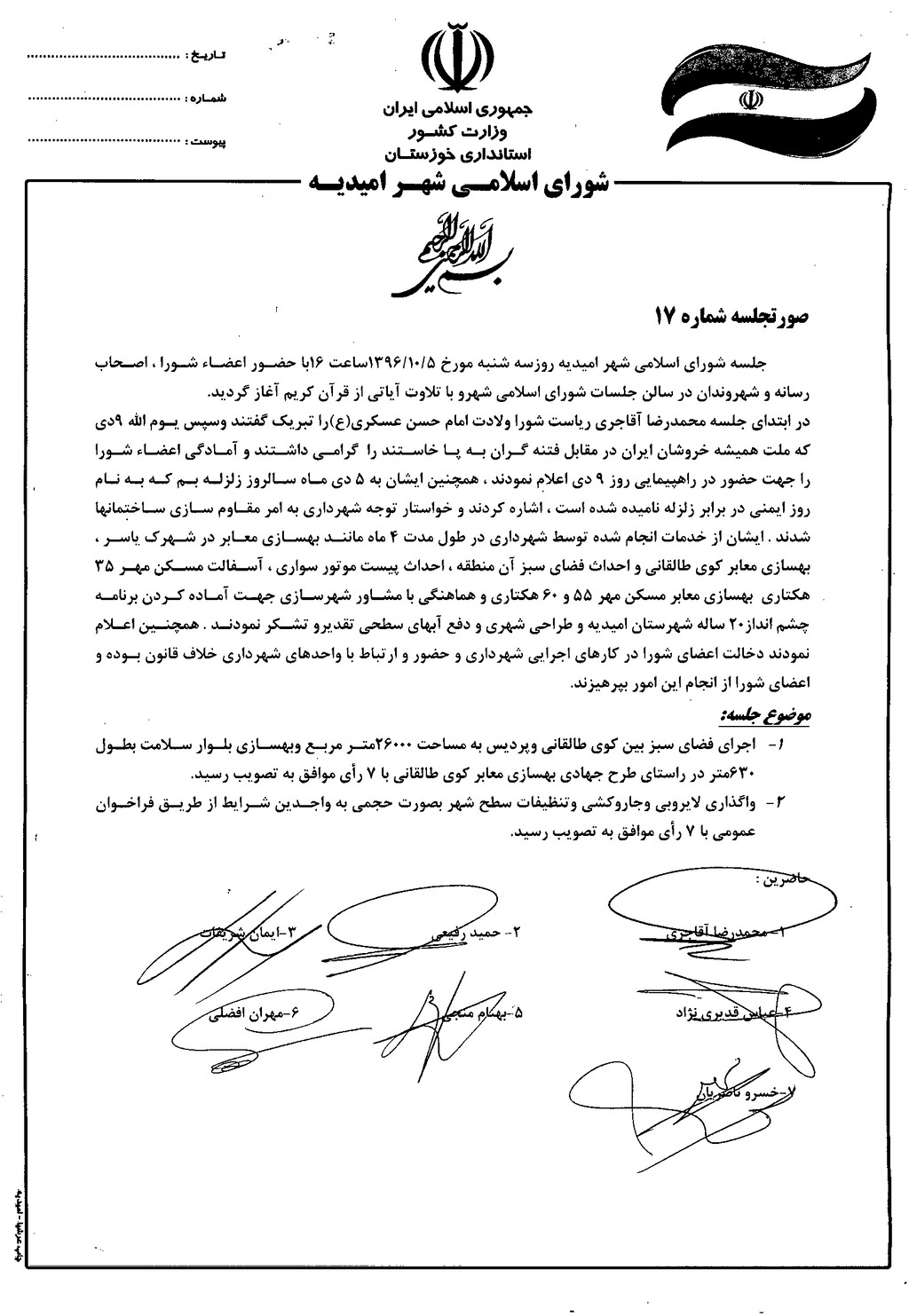 گزارش جلسه شماره ۱۷ مورخ ۹۶/۱۰/۵ شورای اسلامی شهر امیدیه